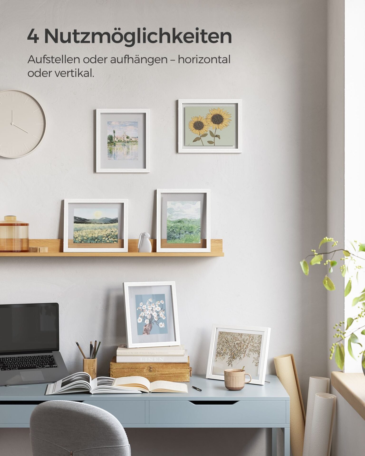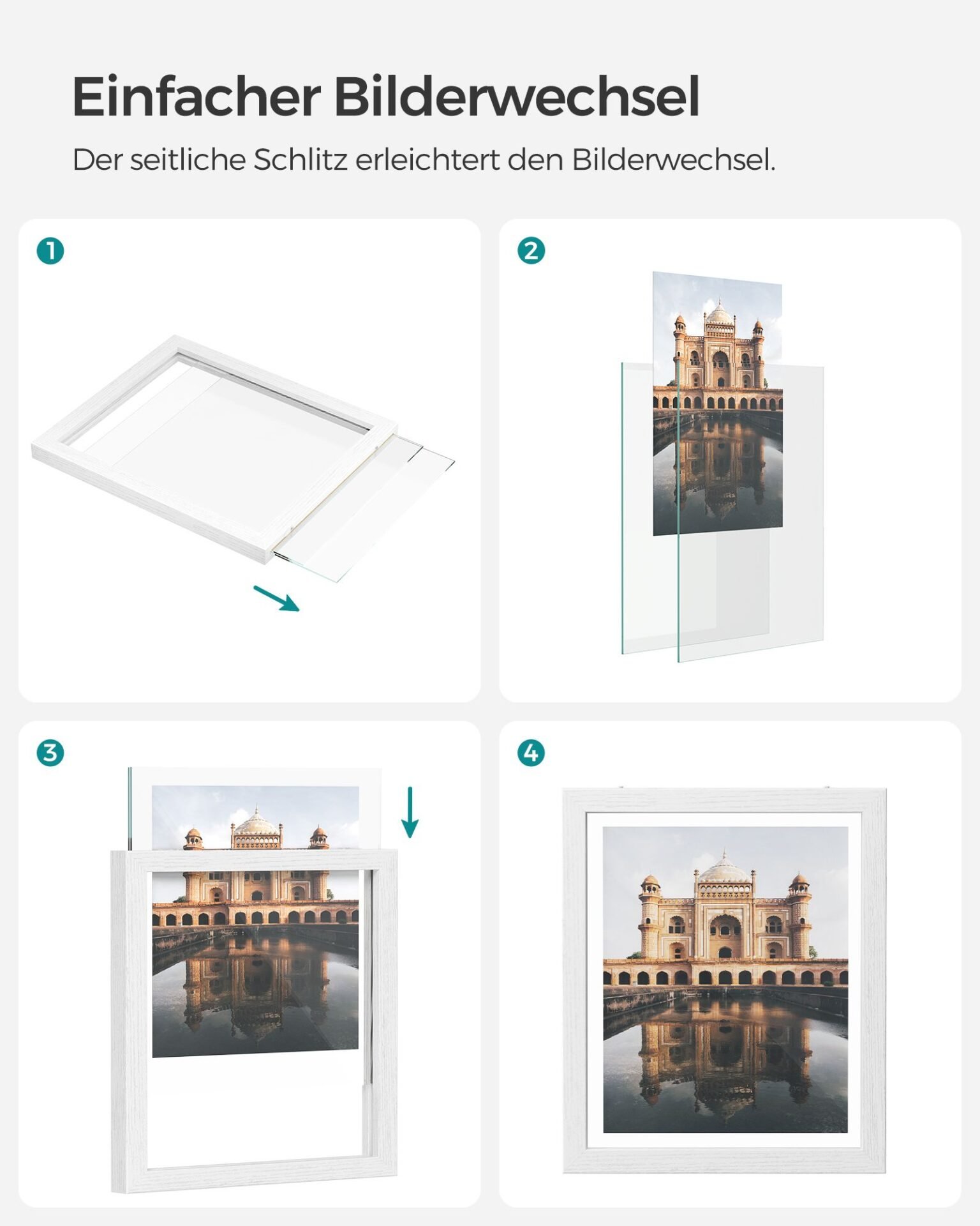 Product Details:Color whiteMaterial: MDF (medium density fibreboard), glassSize: 32 x 27 cm (L x W)Total weight: 2.9 kgScope of delivery:9 * Photo Frames18 x Metal Support Poles9 x paper with markings12 * Glue Dot