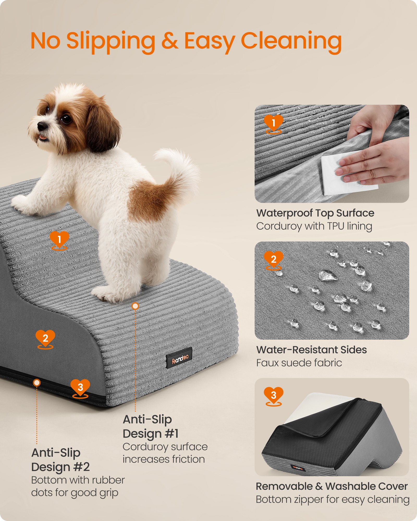 Dubbla halkfria designer: Manchesterytan ökar friktionen mellan ditt husdjurs tassar och trappan, medan den halkfria botten med gummiprickar säkerställer ett fast grepp på golvet. Ditt husdjur kan klättra med trygghet!