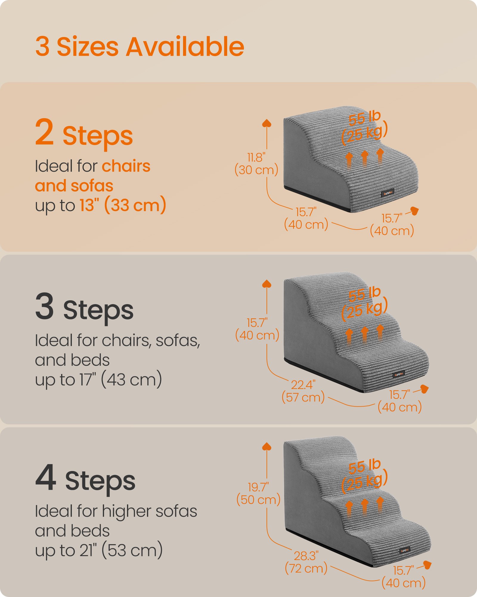 Perfekt för möbler upp till 33 cm: Hundrampen med två steg för små hundar är perfekt för fåtöljer och soffor, med en enkel design och neutral färg som smälter väl in i olika heminredningsstilar.