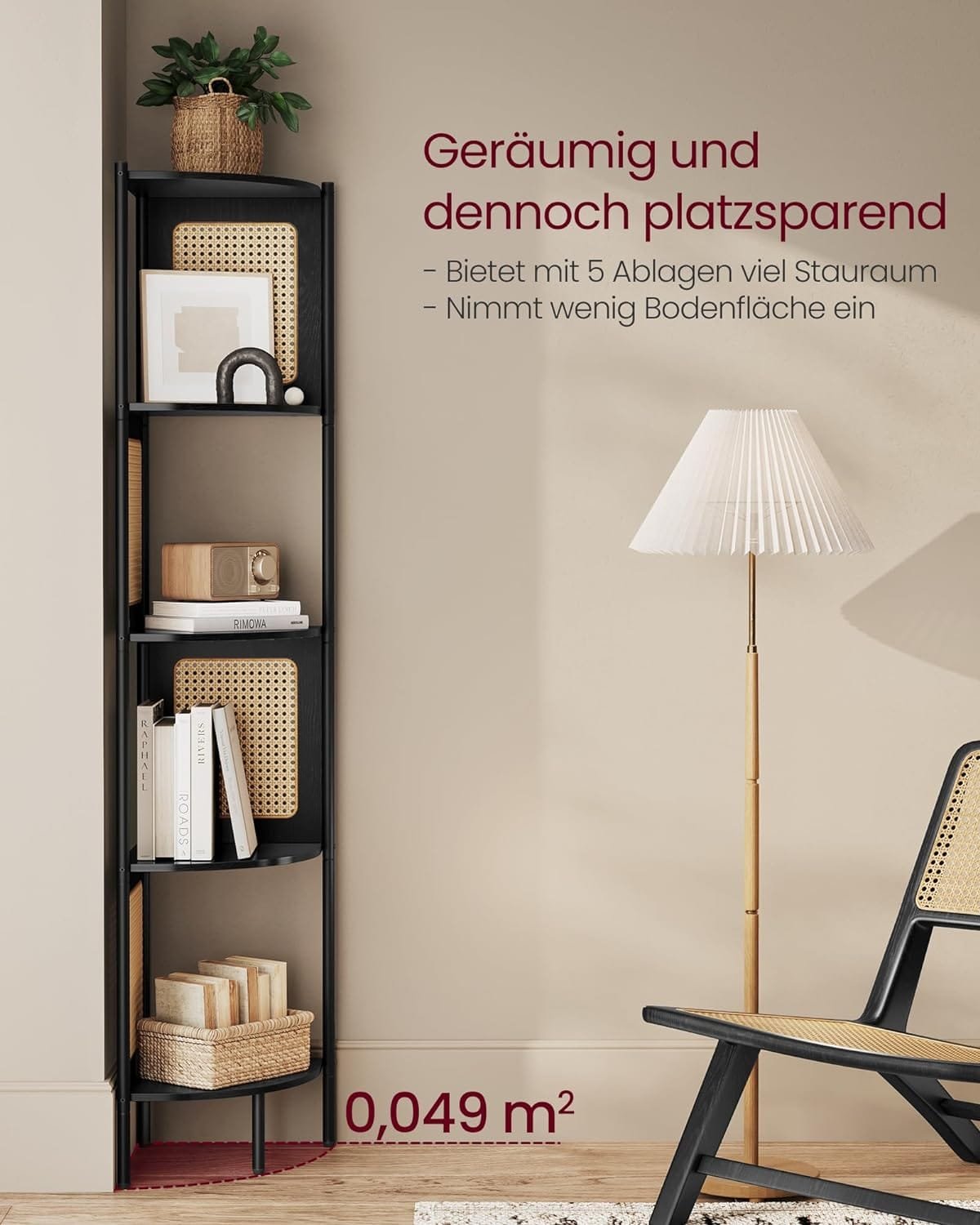 [Rymlig och platsbesparande] Bokhyllan mäter 12,5 x 12,5 x 61,4 tum och har 5 hyllor för böcker, tavelramar, växter och dekorativa element. Tack vare sin form passar den perfekt i alla hörn och sparar utrymme