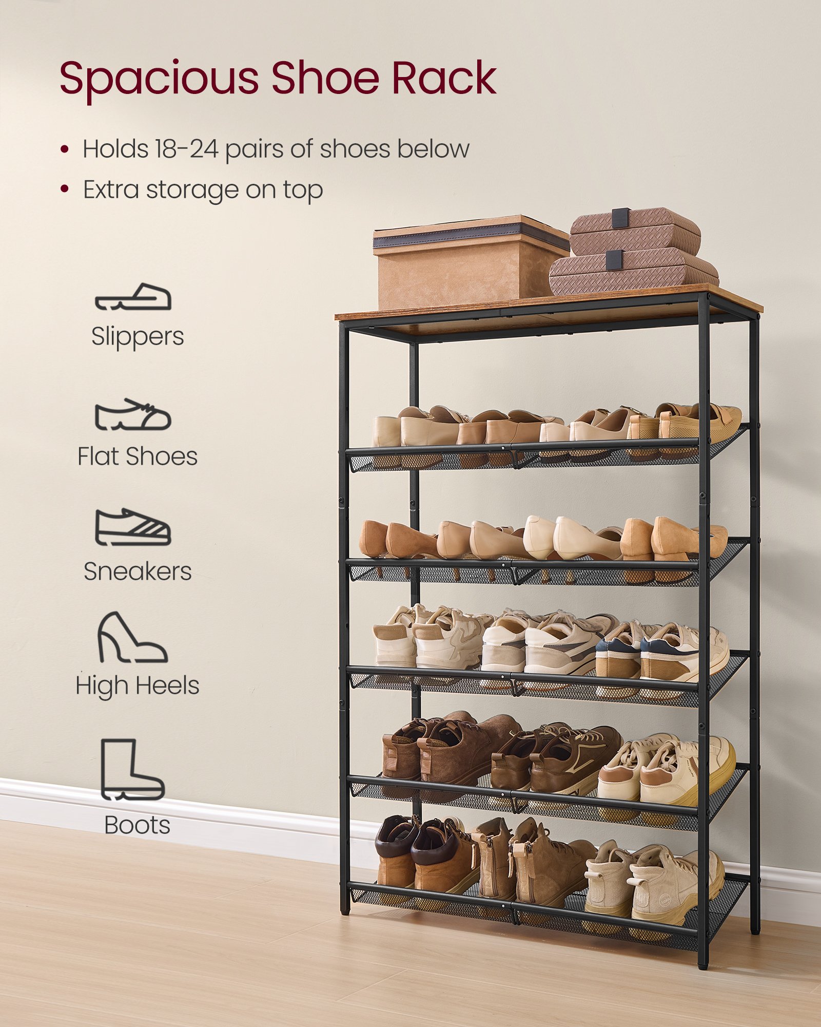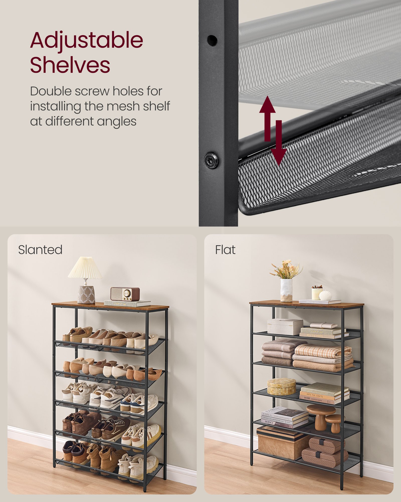 6-våningars skohylla, justerbar fristående organiseringsställ, brunt och svart6-våningars skohylla, justerbar fristående organiseringsställ, brunt och svart