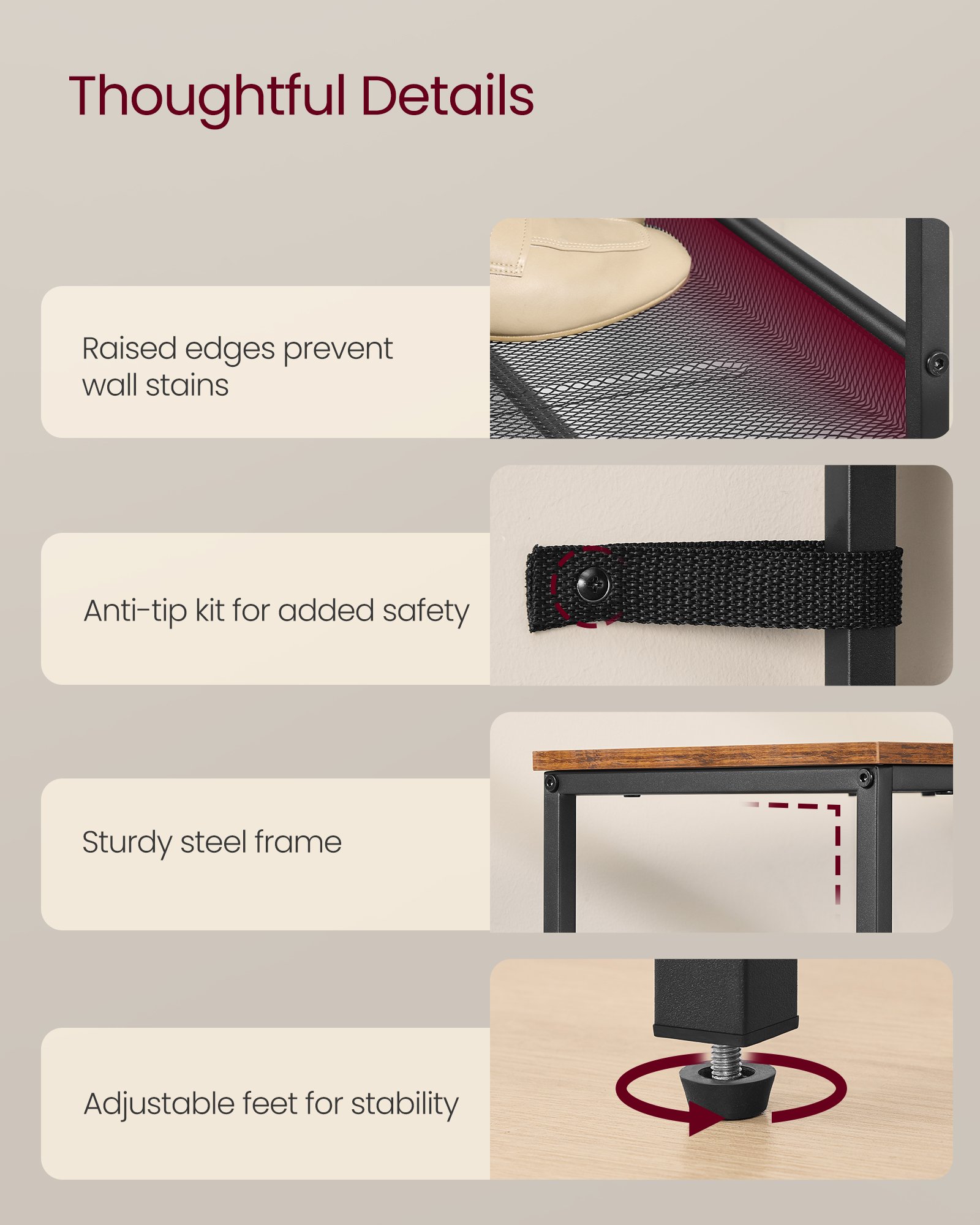 Förvandla din entré med detta rymliga skoställ, utformat för att prydligt organisera din skosamling samtidigt som det erbjuder mångsidig förvaring för väskor och inredning. Justerbara hyllor låter dig visa upp skor på ditt sätt, och de upphöjda kanterna håller dina väggar rena. Tillverkat för hållbarhet och stil smälter detta ställ sömlöst in i alla hem. Njut av problemfri montering och ett snyggt utrymme från dag ett.
