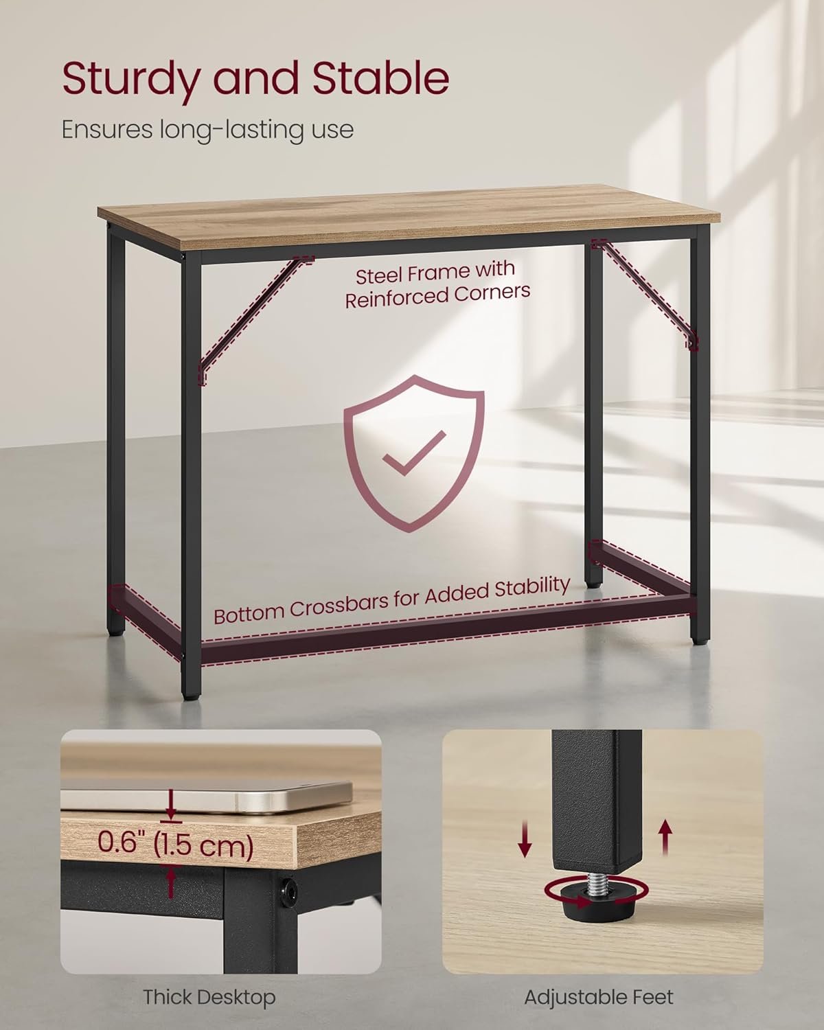 【ROBUST OCH HÅLLBAR】Den tjocka bordsskivan och den högkvalitativa stålramen säkerställer en stabil och robust struktur, vilket ger detta skrivbord en lång livslängd och en hög lastkapacitet på upp till 50 kg