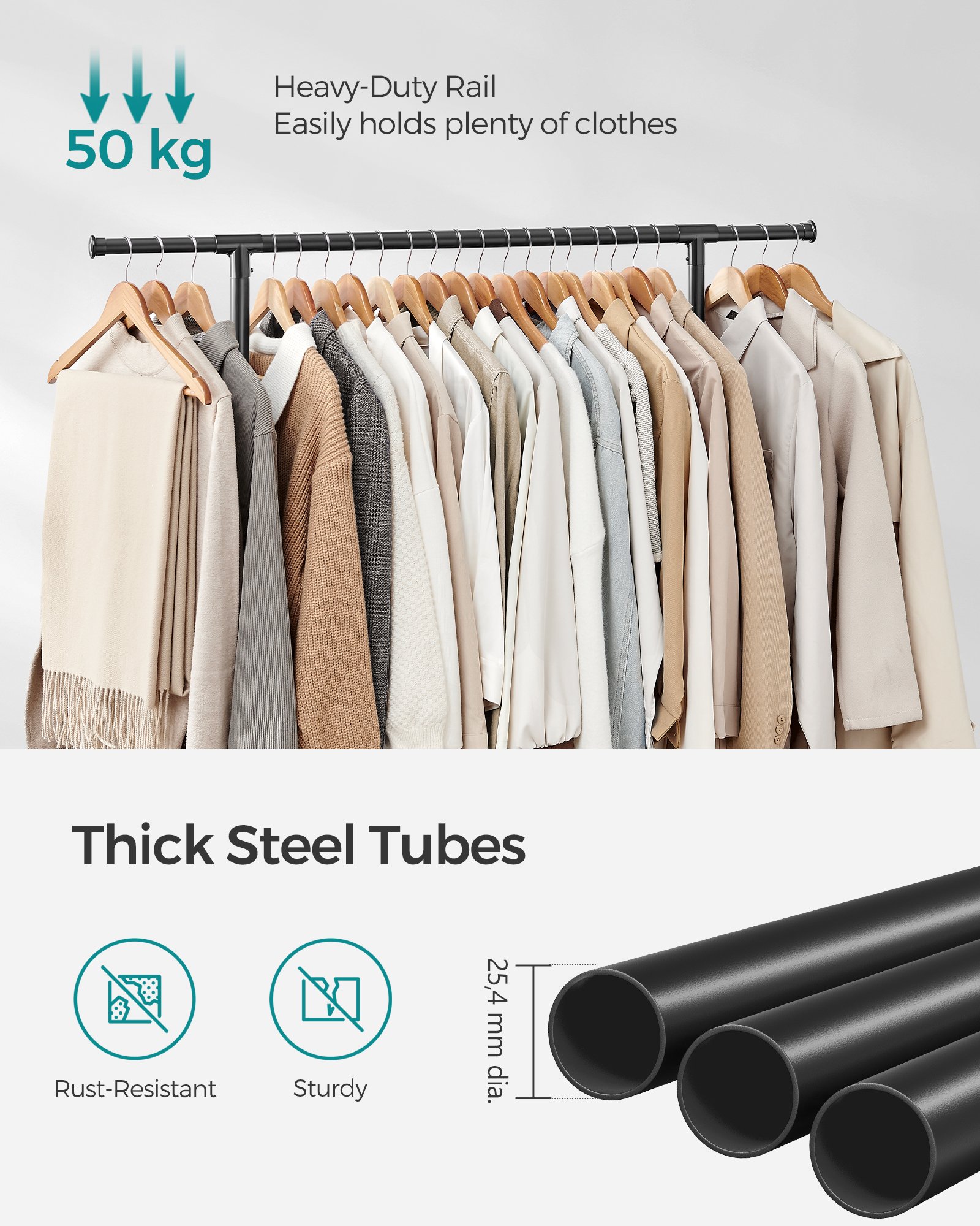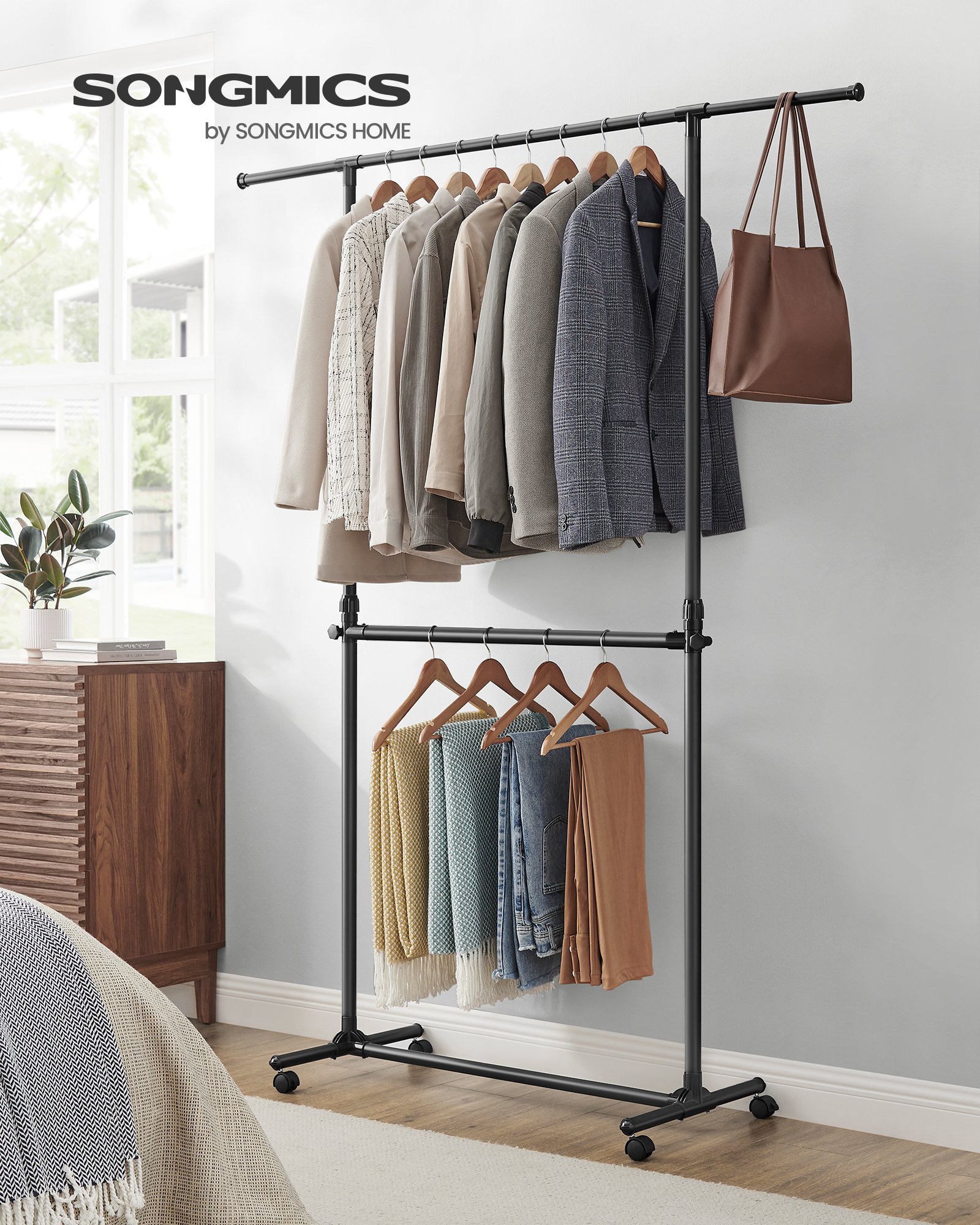[Två skenor för dubbelt utrymme] Med 2 skenor att hänga kläder från maximerar denna klädställning ditt förvaringsutrymme och hjälper dig att få ut det mesta av ditt utrymme.