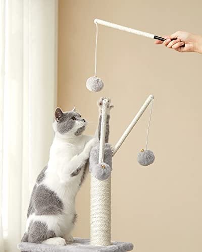 Avtagbara pom pom pinnar: Ovanpå det lilla kattträdet finns 3 pom pom pinnar – oändligt roligt för katter som älskar att leka! Dessutom är alla 3 pompomspinnarna avtagbara så att du kan leka med dina katter tillsammans för ännu roligare