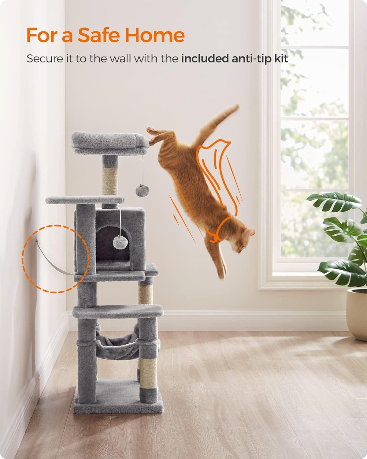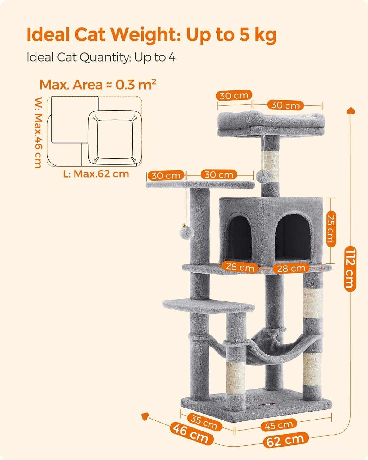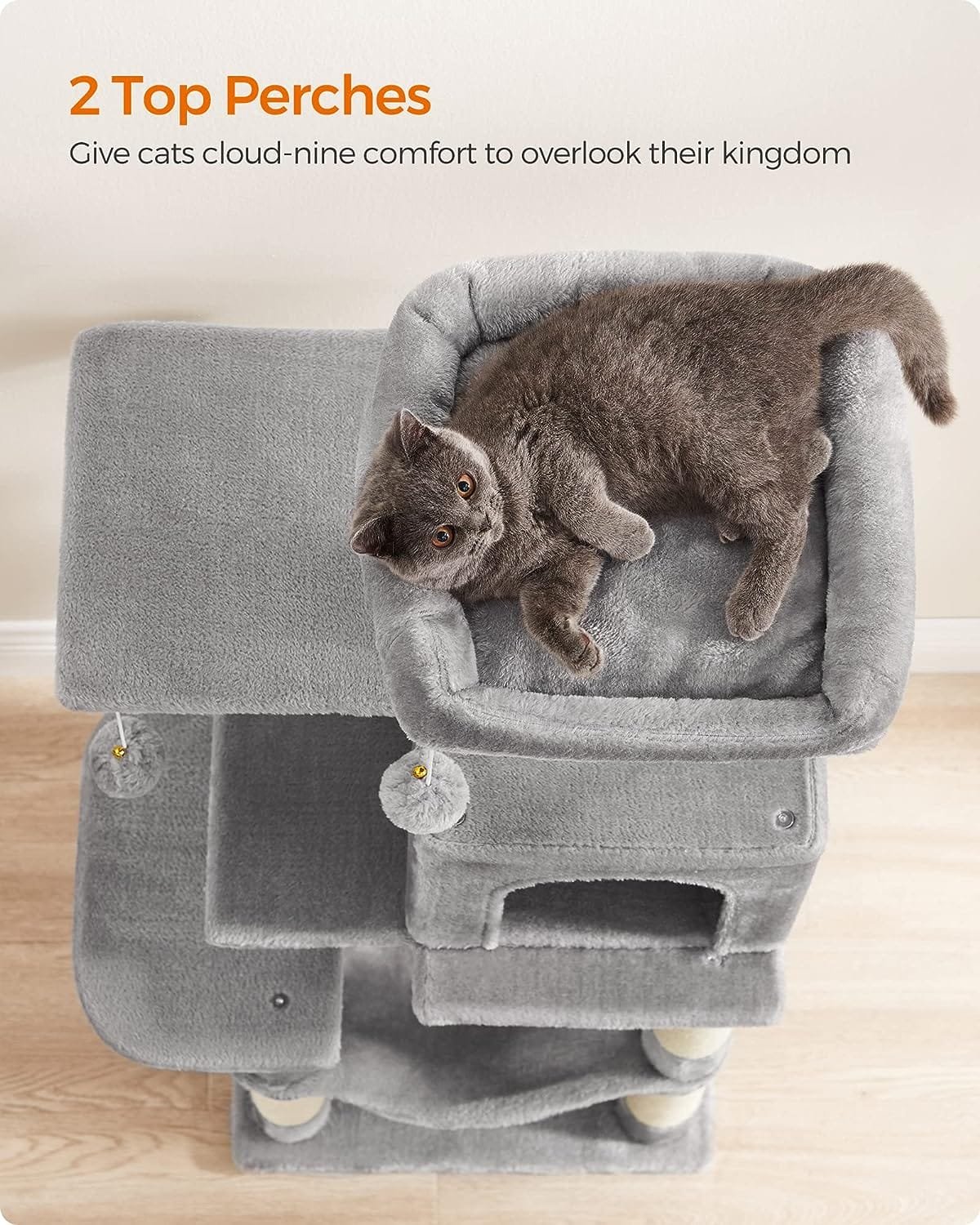 [2 sittpinnar & 1 grotta] Det här kattträdet har två topppinnar och en bekväm kattgrotta, vilket ger flera mysiga platser för katter att varva ner och observera från – perfekt för hushåll med flera katter