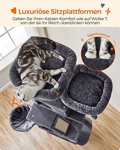 - Mångsidig design: 2 rymliga kattgrottor, en mysig korg och en fluffig hängmatta ger en idealisk balans mellan lek och vila.