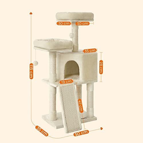 Egenskaper:- Färg: Beige- Material: spånskiva, plysch, sisal- Mått: 50 x 35 x 115 cm (lxbxh)- Vikt: 10,3 kgLeverans:- 1 x Cat Tree- 1 x Anti– Tipping- 1 X Användarmanual