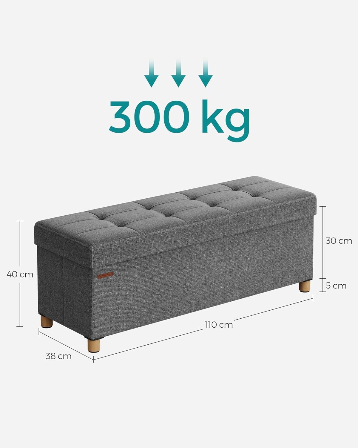 Färg: mörkgrå. Material: MDF-skiva, skumstoppning, linneliknande tyg. Mått: 38 x 110 x 40 cm (d x b x h). Vikt: 10 kg. Maximal statisk lastkapacitet: 300 kg. Kapacitet: 112 l