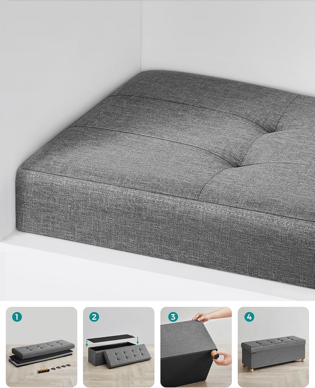 【SOLIDA OCH GENOMTÄNKSAMA TRÄFÖTTER】 De fyra benen på denna förvaringsbänk kan hålla det rent undertill. Varje ben har en halkfri dyna för att säkerställa stabilitet och förhindra repor på golvet.