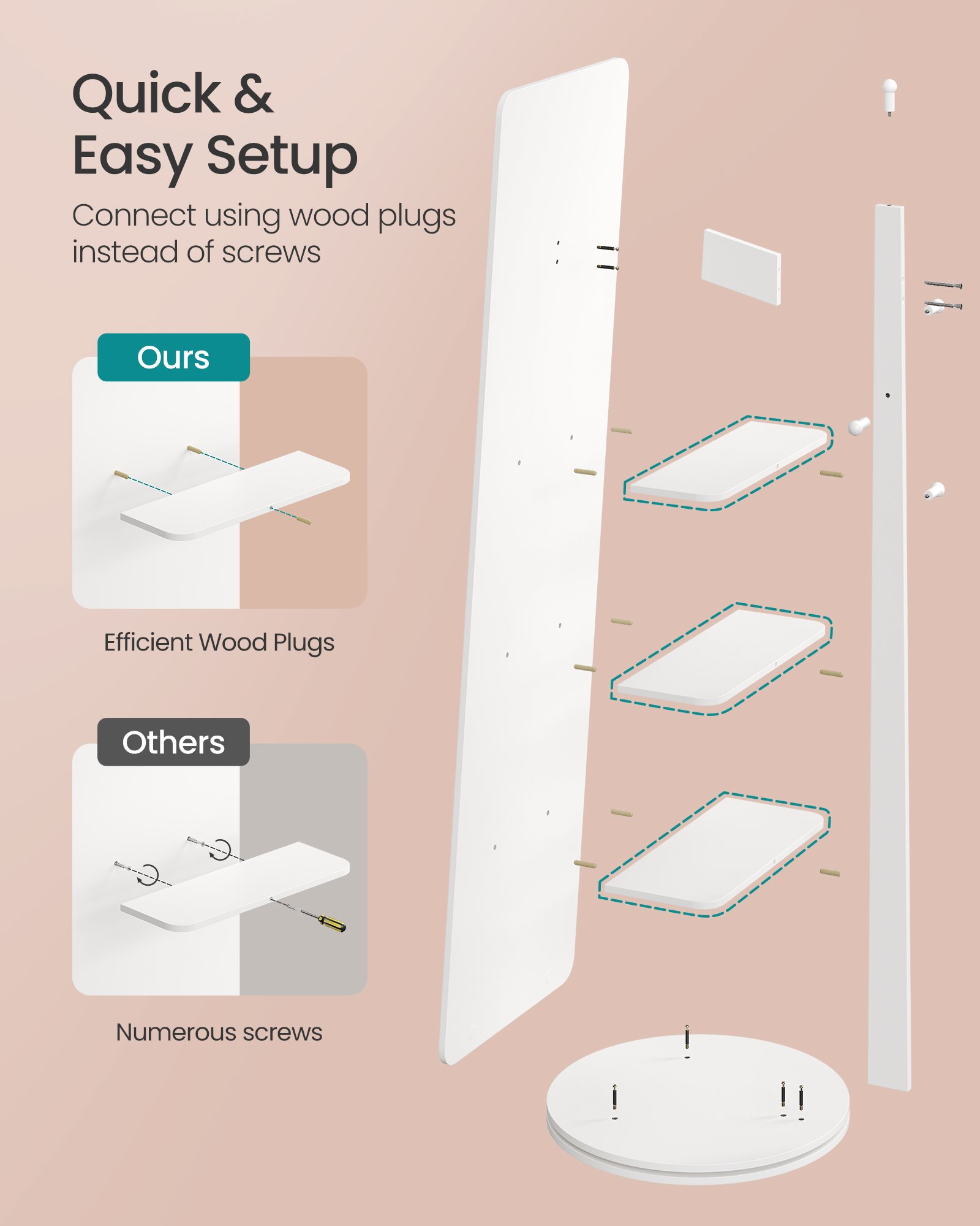 Lätt att montera: Med tydliga instruktioner, märkta delar och minimalt med skruvar kan din roterande spegel med förvaring snabbt och enkelt monteras.