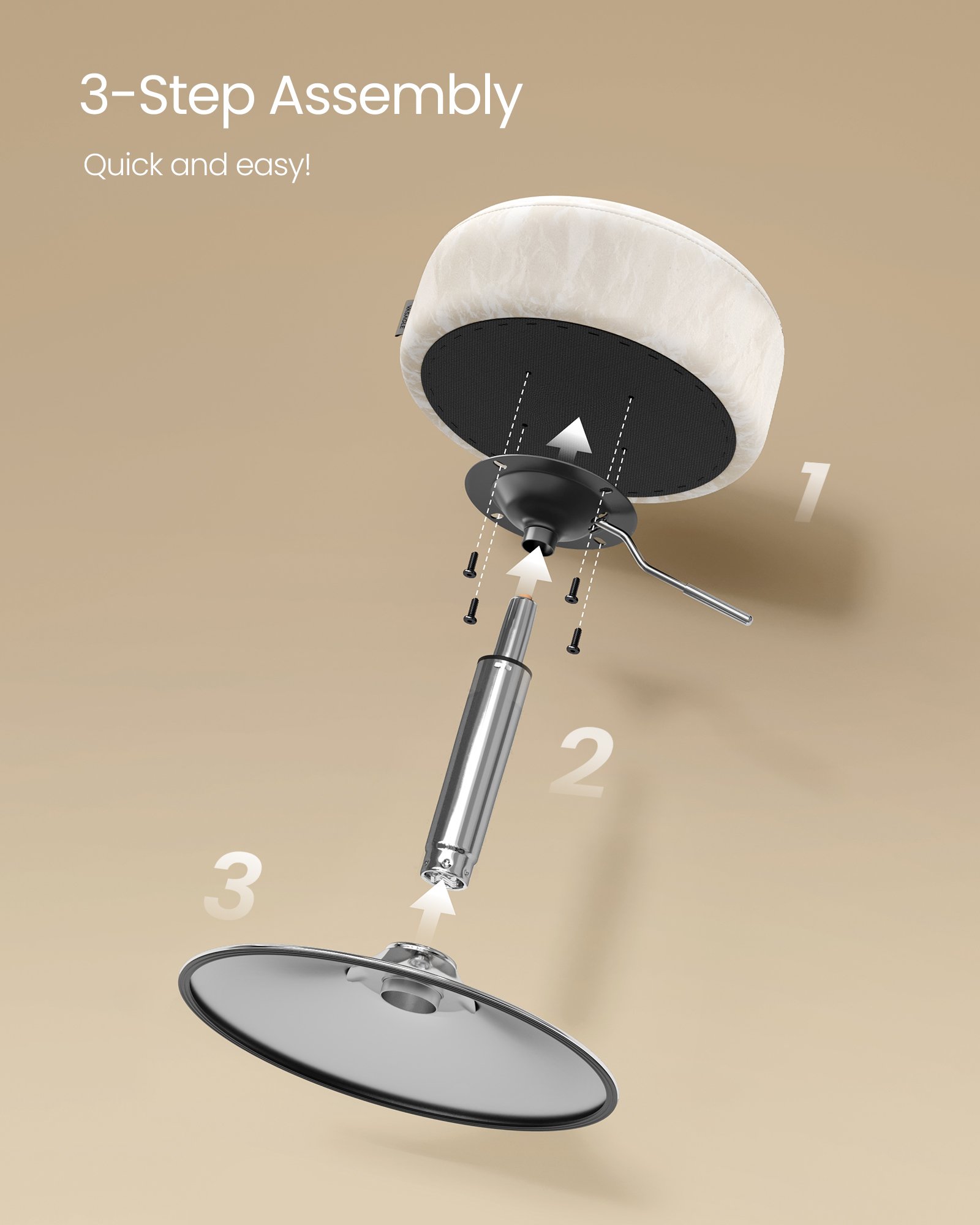 Problemfri installation: Tydliga instruktioner och märkta delar låter dig montera denna höjdjusterbara snurrpall i bara 3 enkla steg.