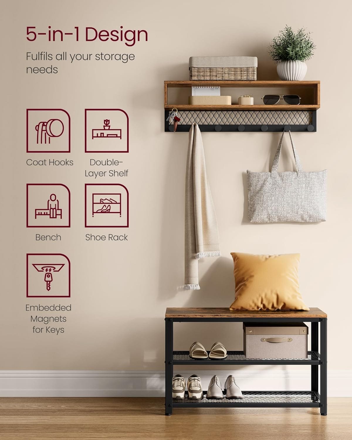 [5-i-1 Hall-träd med bänk] Med en hylla i dubbla lager för dekorationer, 7 klädkrokar för väskor och kläder, 3 inbäddade magneter för nycklar och ett 2-lagers skoställ, har denna multifunktionella del dig täckt!