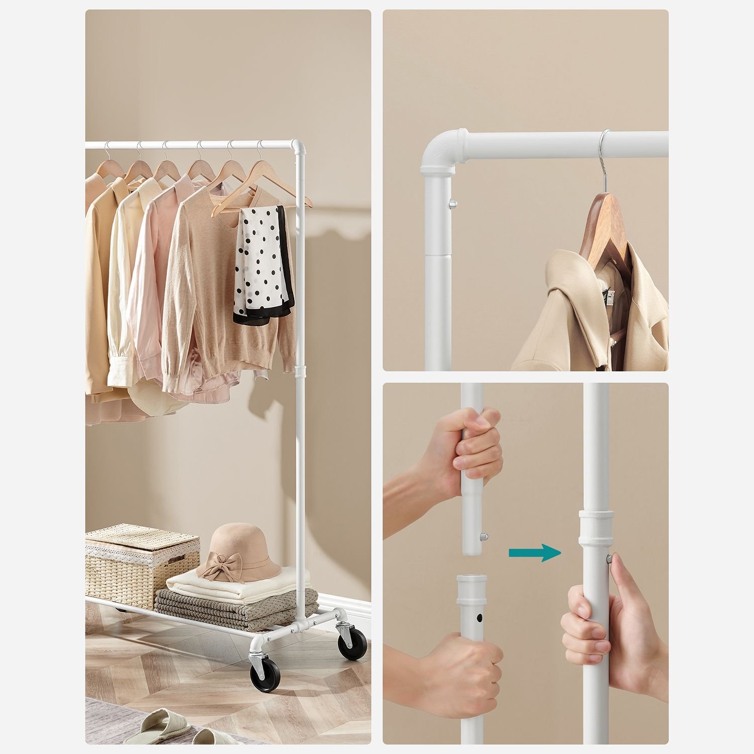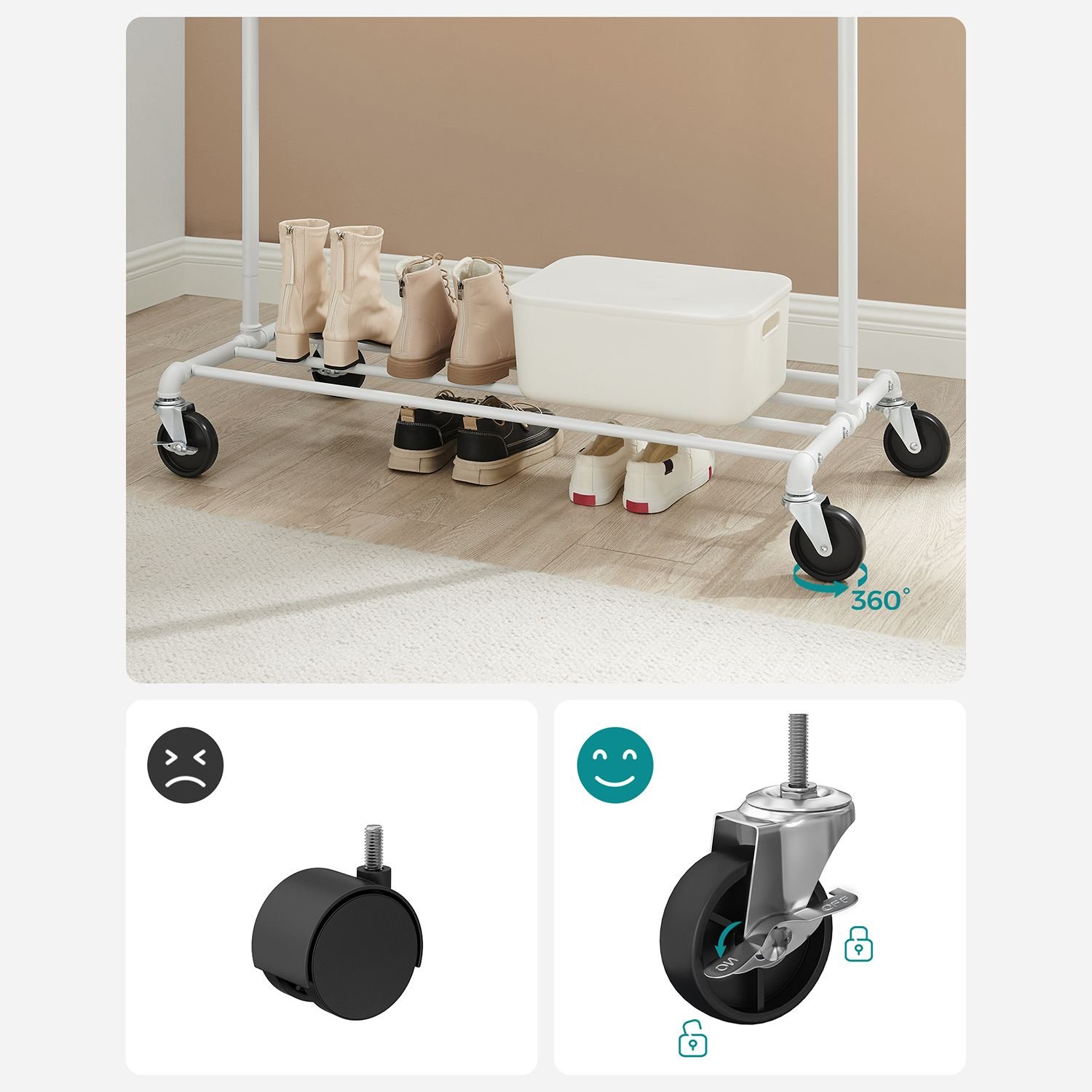 Lätt att flytta eller förvara: 4 universella PP-hjul med 2 låsbromsar säkerställer att denna klädstång kan förflyttas smidigt från en plats till en annan och stannar på plats.