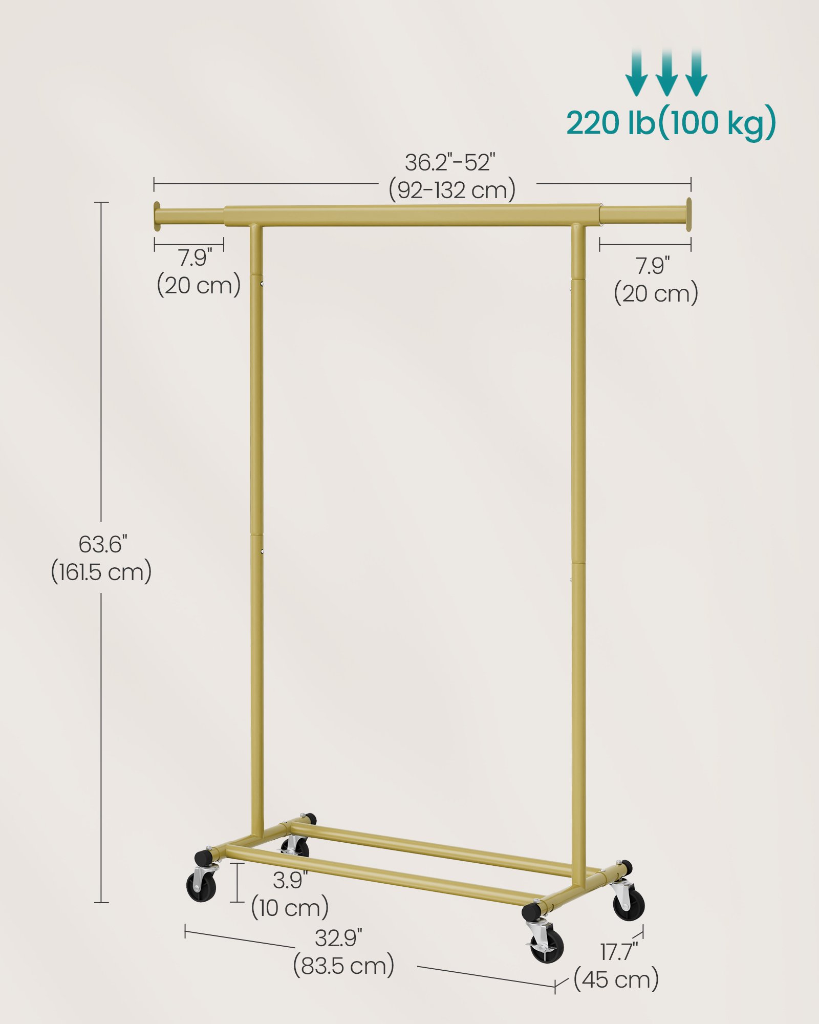 Klädställning på hjul, kraftig, med utdragbar upphängningsskena, 100 kg lastkapacitet, ljusguld