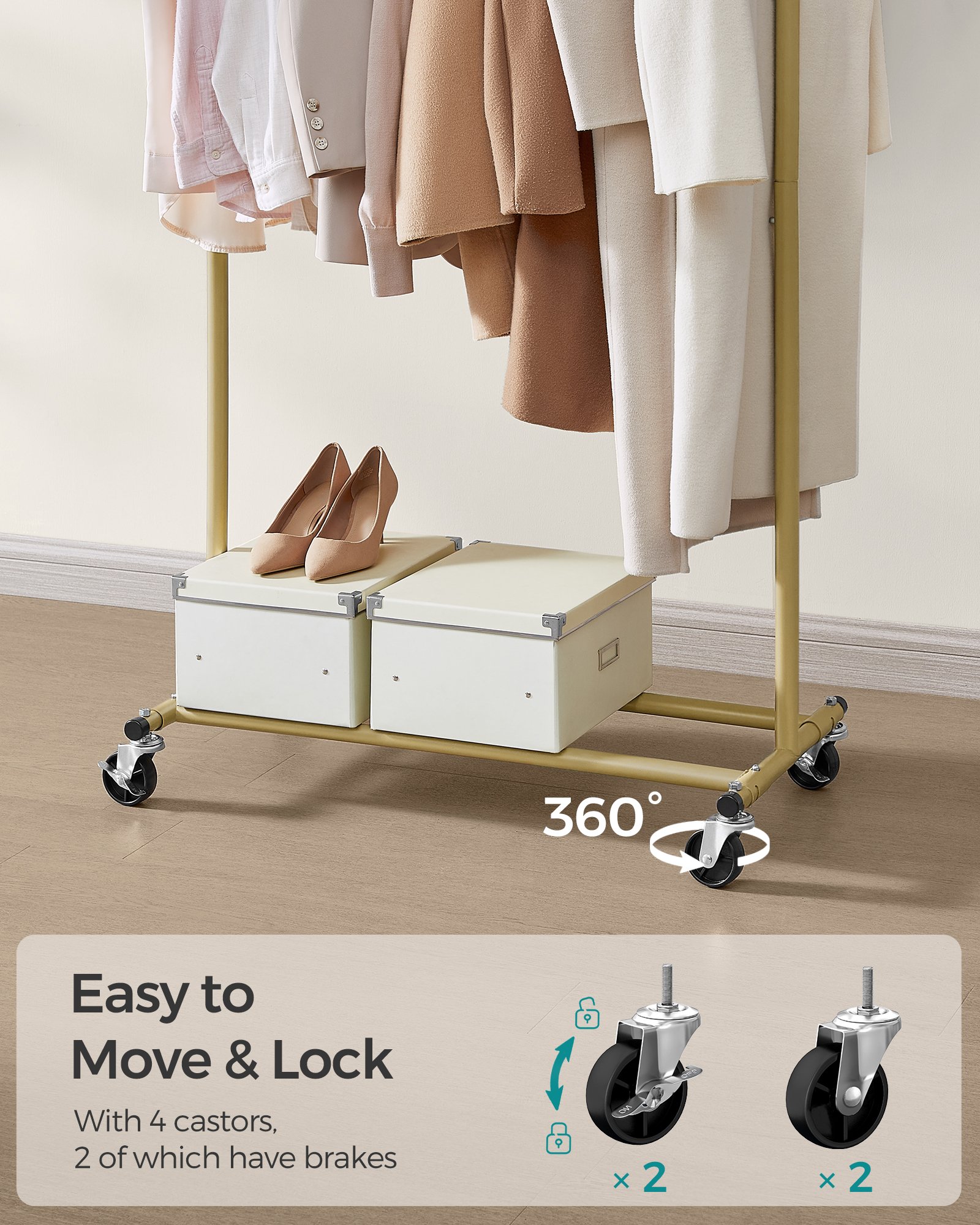 【LÄTT ATT FLYTTA OCH LÅSA】Denna klädstång har 4 360° svängbara hjul, varav 2 är låsbara, vilket gör att du enkelt kan flytta den från ditt sovrum till din garderob och låsa den på plats vid behov