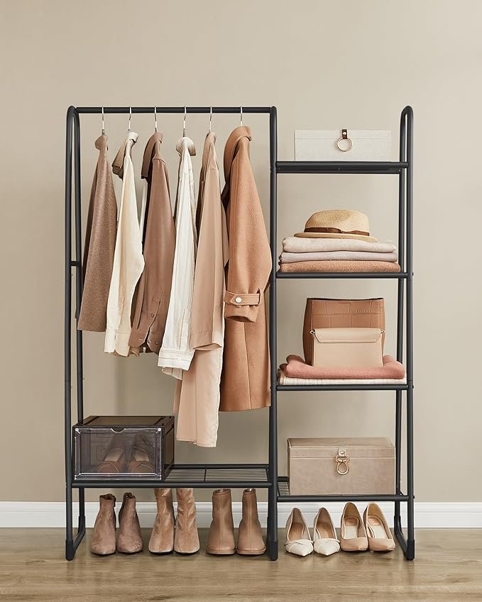 【MULTIFUNKTIONELL KLÄDSTÄLL】Denna klädställning kombinerar en hängstång och förvaringshyllor, vilket gör att du kan organisera kläder, väskor, accessoarer och skor på ett ställe, vilket gör det enklare att snabbt hitta det du behöver.