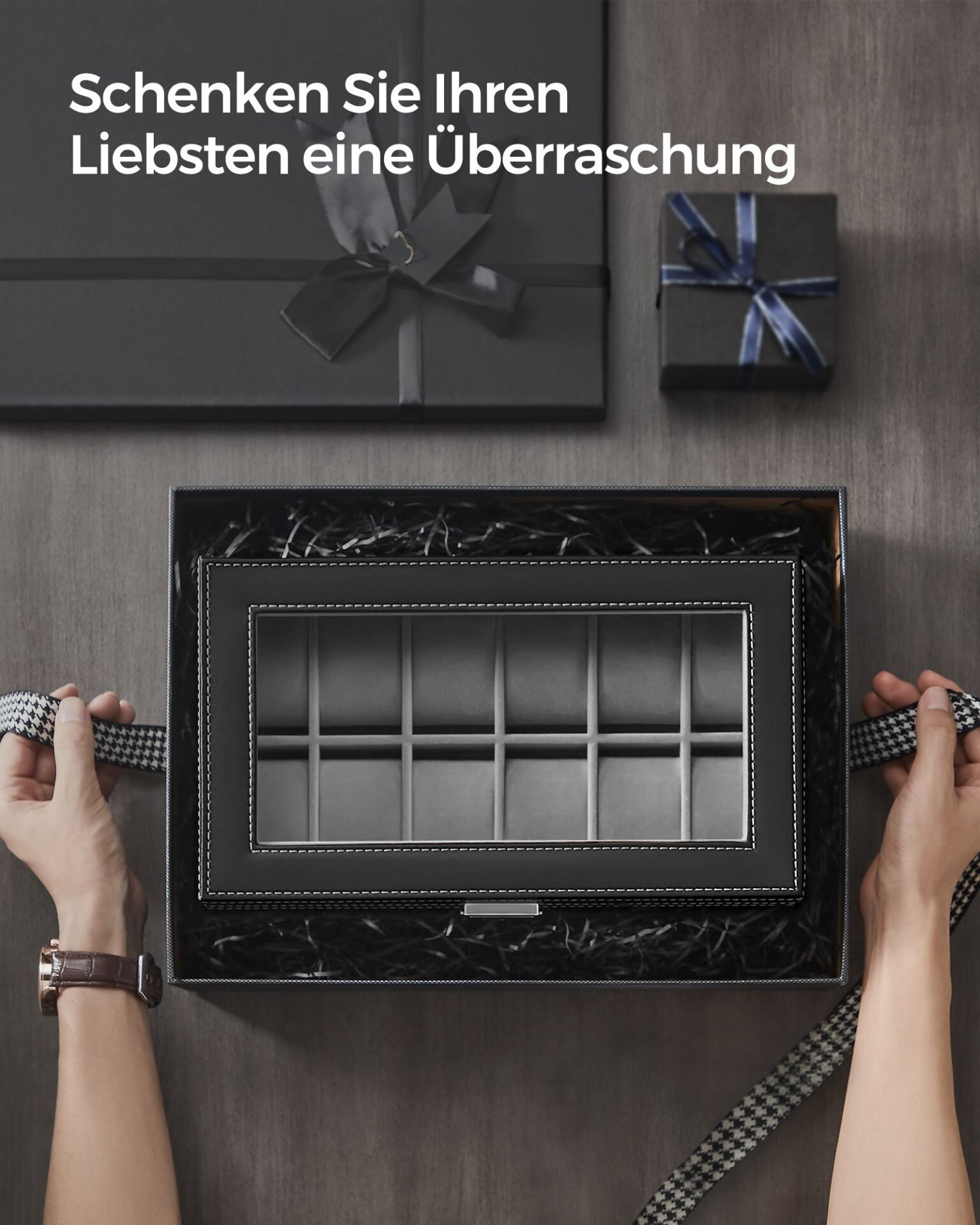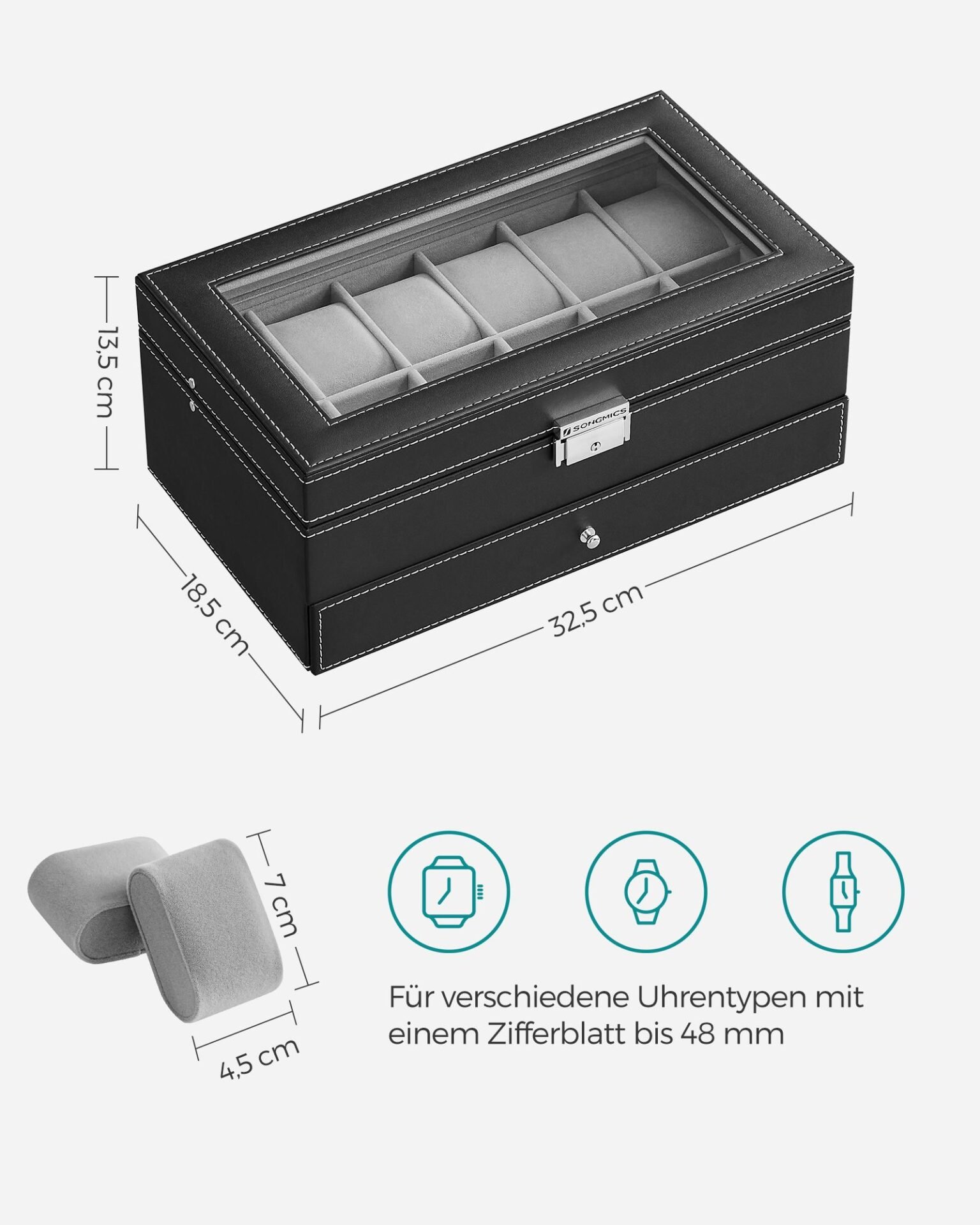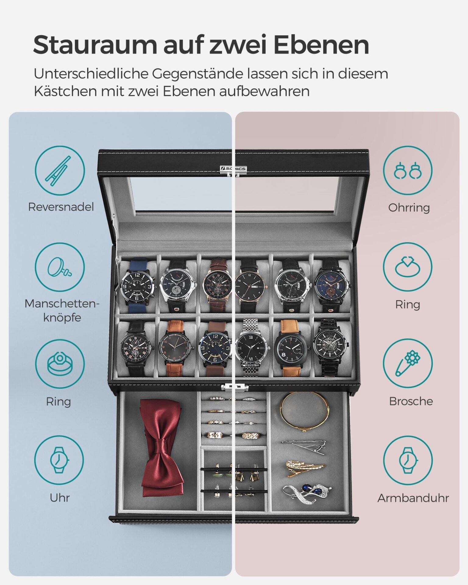 [2 lager för klockor och mer] Denna klocklåda har 12 fack på toppen för klockor med en skärmstorlek upp till 48 mm. Olika fack i den nedre lådan kan förvara dina ringar, armband och andra smycken.