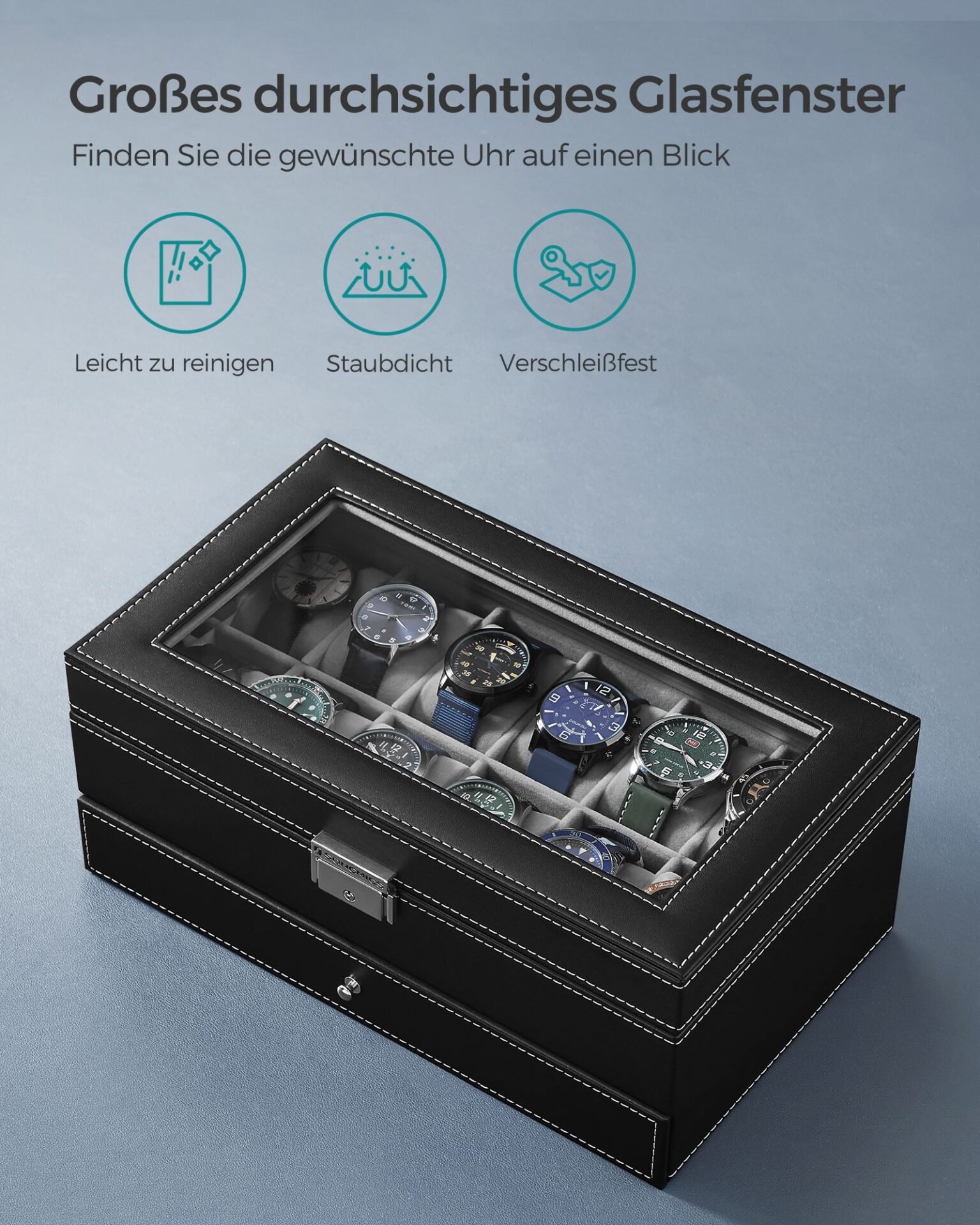 [Klart glaslock] Det genomskinliga glaslocket på denna klockförvaringslåda låter dig se och hitta rätt klocka med en blick samtidigt som den skyddar den från damm. Dessutom är den hållbar och lätt att rengöra
