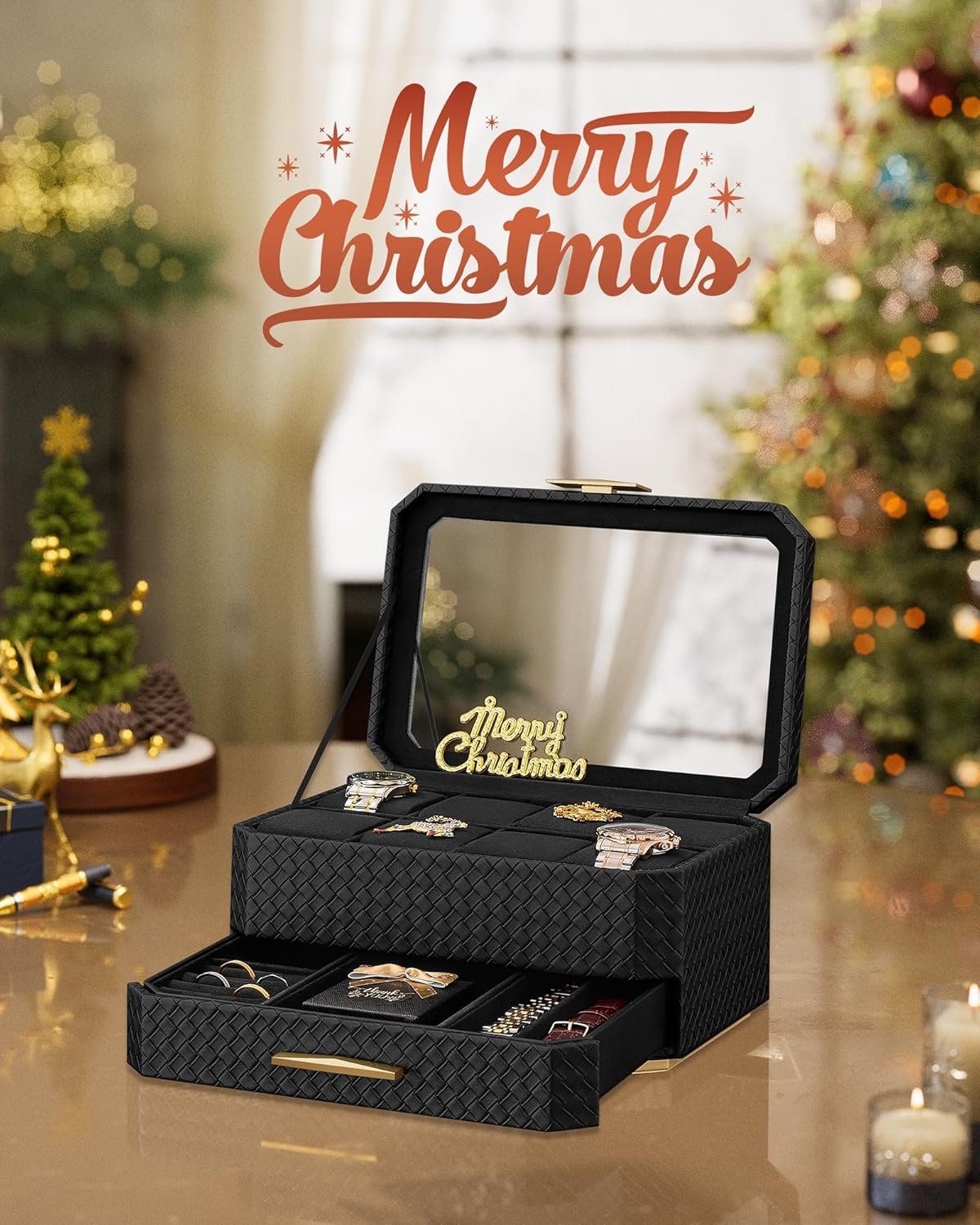 【DUBBLA LAGER, MÅNGSIDIGA FÖRVARINGSPLATSER】Förvara dina klockor på det översta lagret med 8 platser för klockor i alla storlekar och organisera dina tillbehör efter typ i lådan med olika fack. Klockor, ringar, broscher, klockarmband och mer – alla har sina platser.