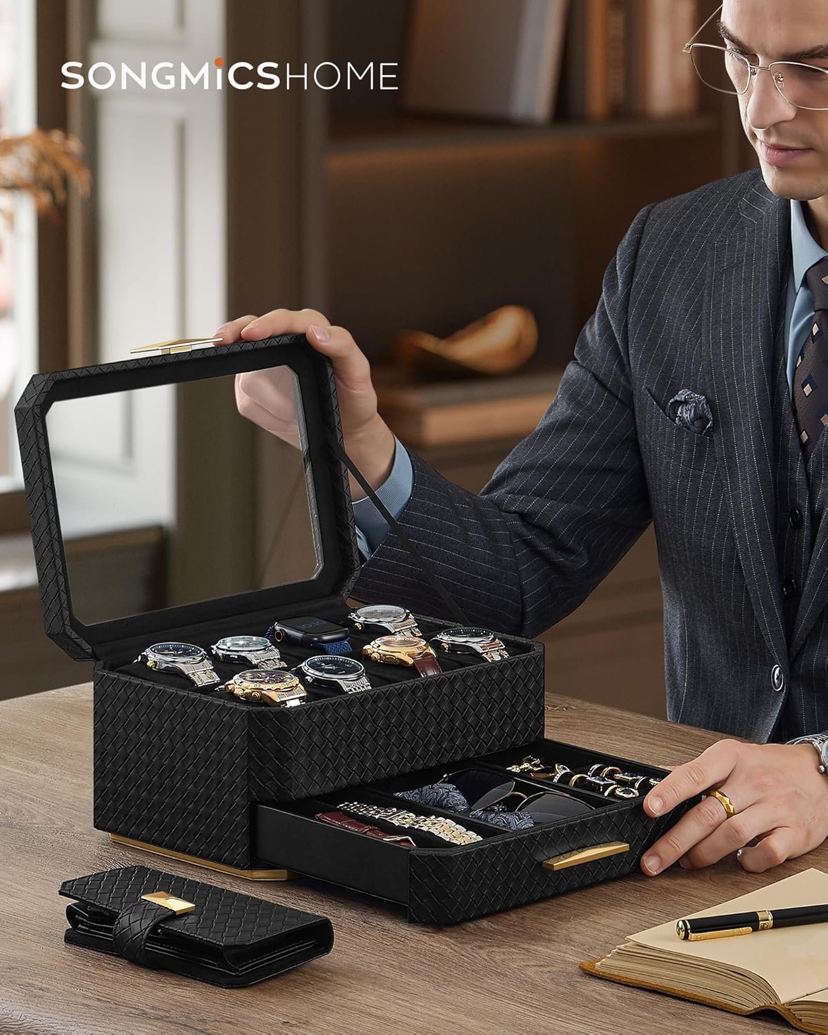VISA DIN STIL】Tidlös elegans möter modern lyx med denna klocklåda med 8 platser från SONGMICS HOME RONNE-kollektionen. Den kombinerar en elegant design med vävt präglat PU-läder accentuerat med baguette-inspirerad hårdvara och är din stildeklaration.