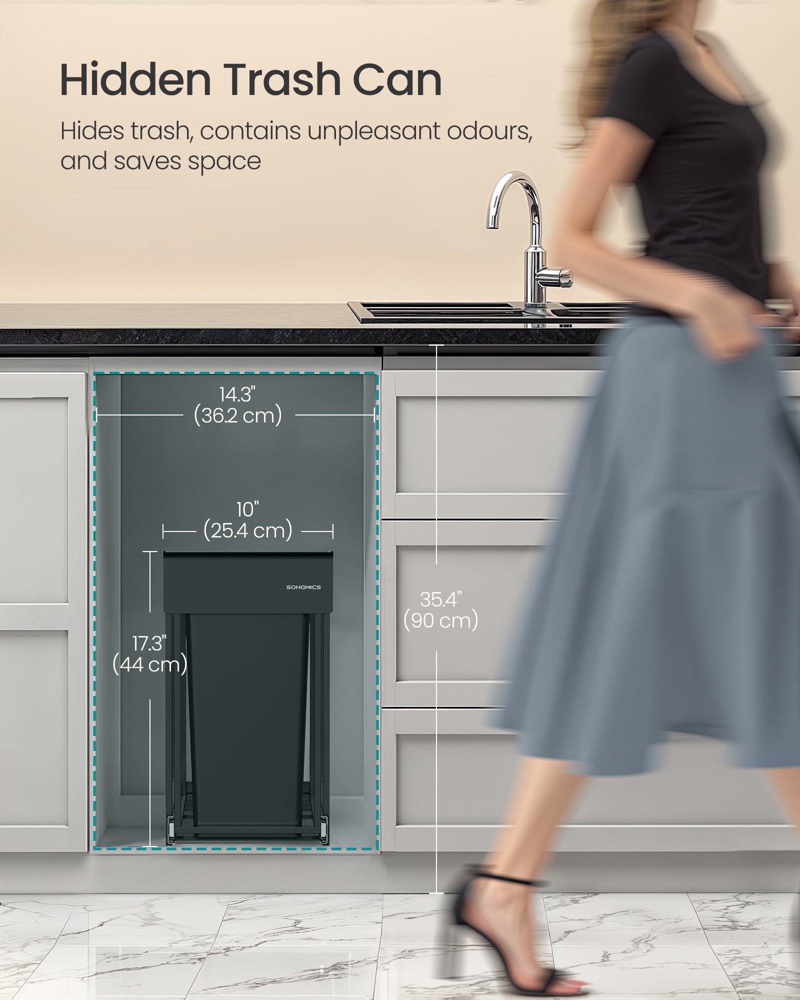 Dold för effektivitet: Denna utdragbara soptunna är inbyggd i ditt köksskåp och håller skräp utom synhåll, kontrollerar obehagliga lukter och sparar värdefullt köksutrymme. Det är den perfekta lösningen för ett snyggt och effektivt kök.