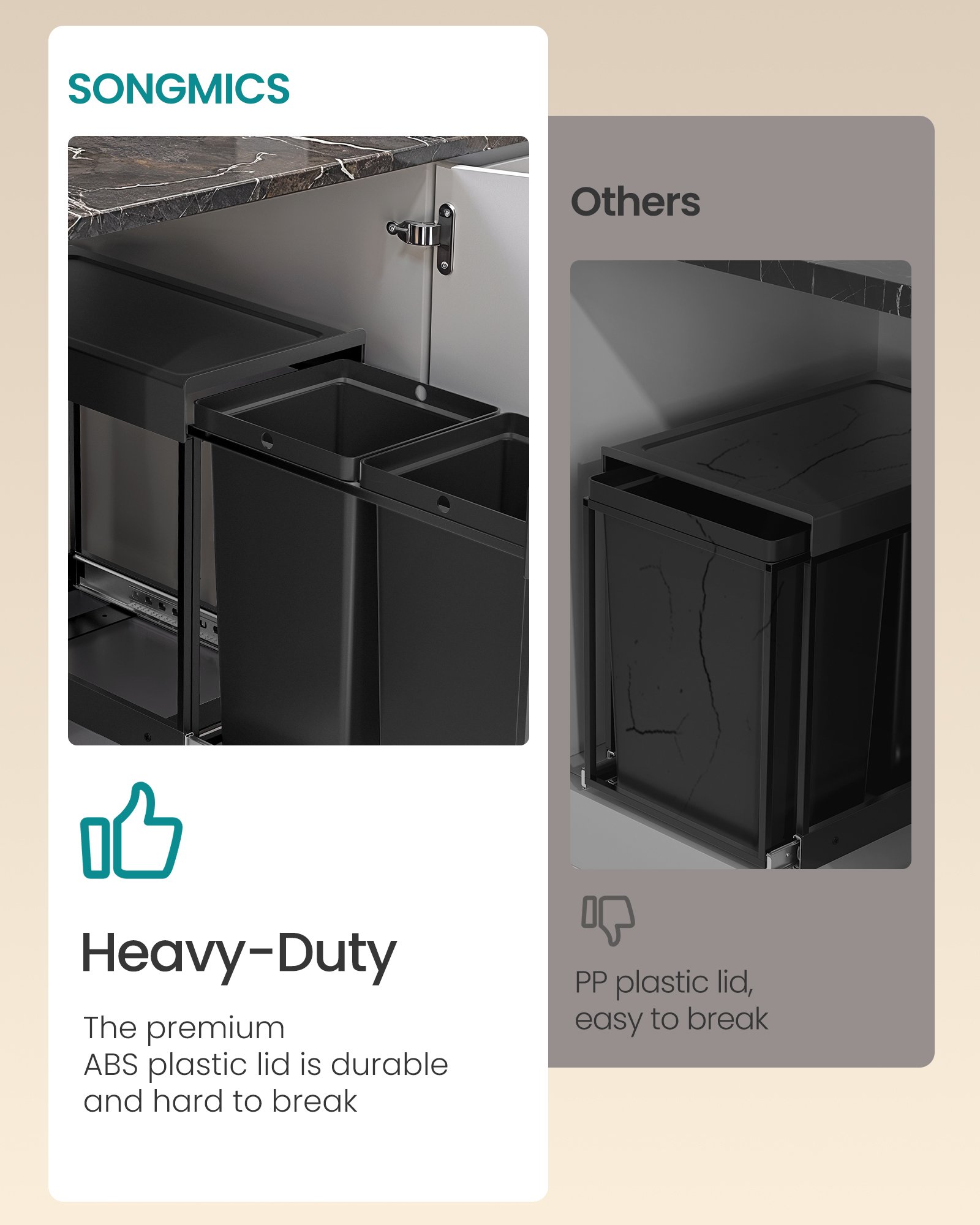 Dubbla fack för sortering: Med 2 uttagbara innerbehållare möjliggör denna soptunna för köksskåp enkel sortering och tömning av avfall. Våra 15-liters soppåsar med kod L passar perfekt till denna behållare.