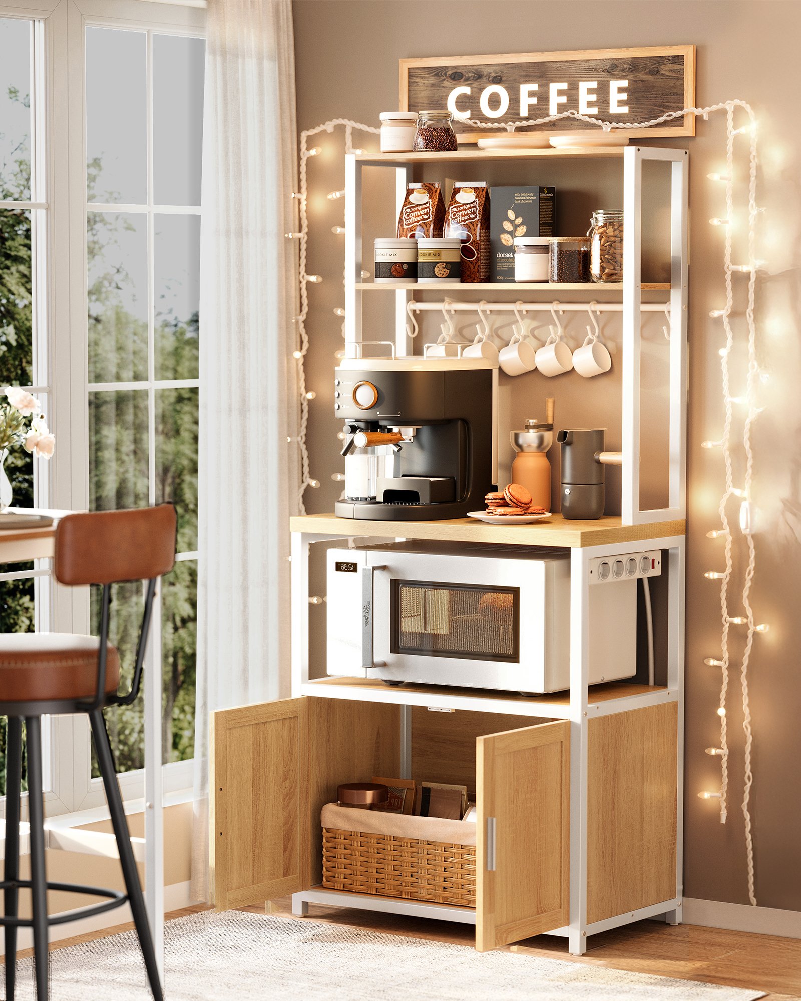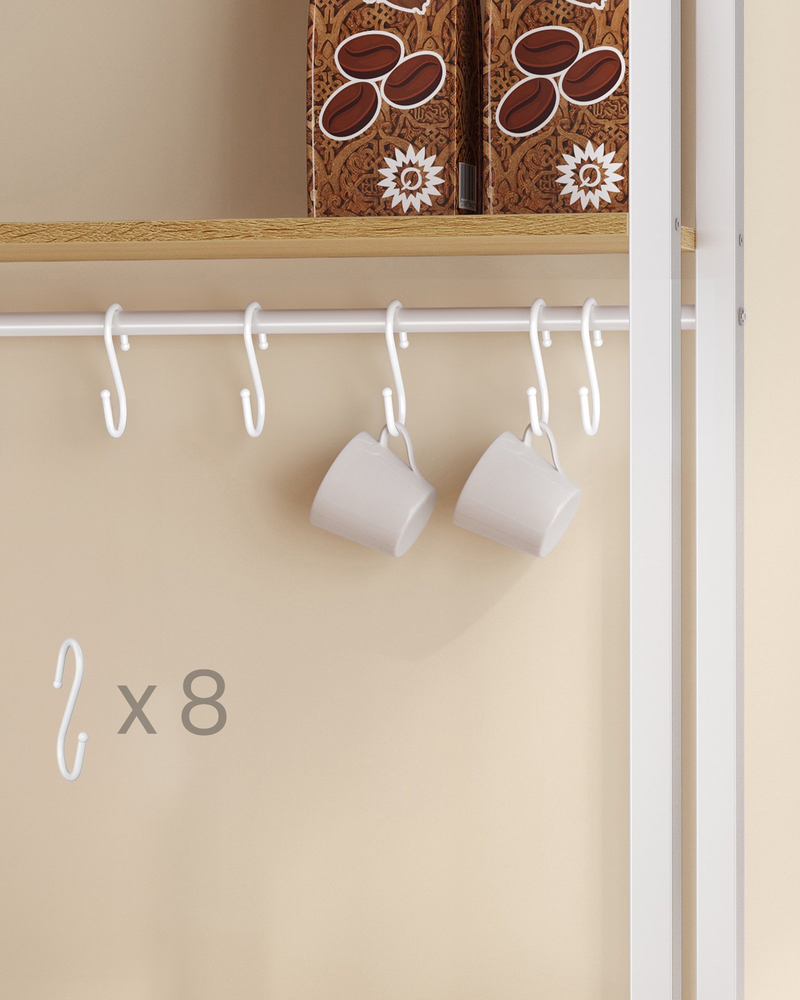 Rymlig förvaring: med 2 hyllor högst upp för dina kryddor, 8 krokar för att hänga upp koppar, en stor bricka för kaffemaskinen, en hylla längst ner för mikrovågsugnen och ett stort skåp för förvaring av fritös och porslin.