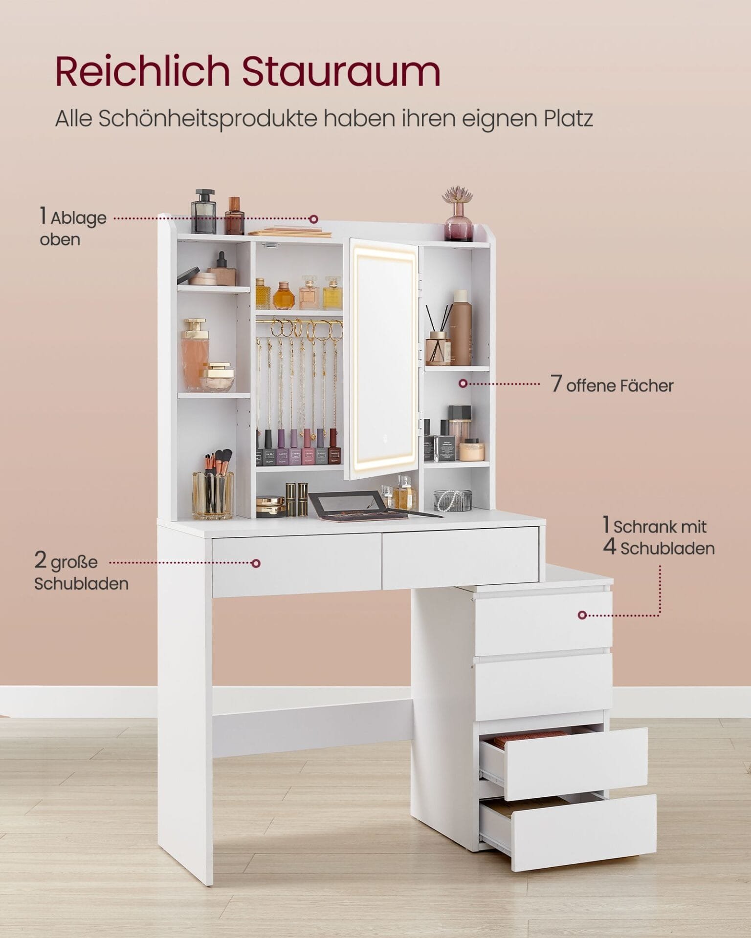 [Gott om förvaringsutrymme] En topphylla, 7 öppna fack, 2 stora lådor, 2 hyllor och krokar bakom spegeln och ett skåp med 4 lådor. Detta sminkbord erbjuder tillräckligt med utrymme för att förvara alla dina saker prydligt.
