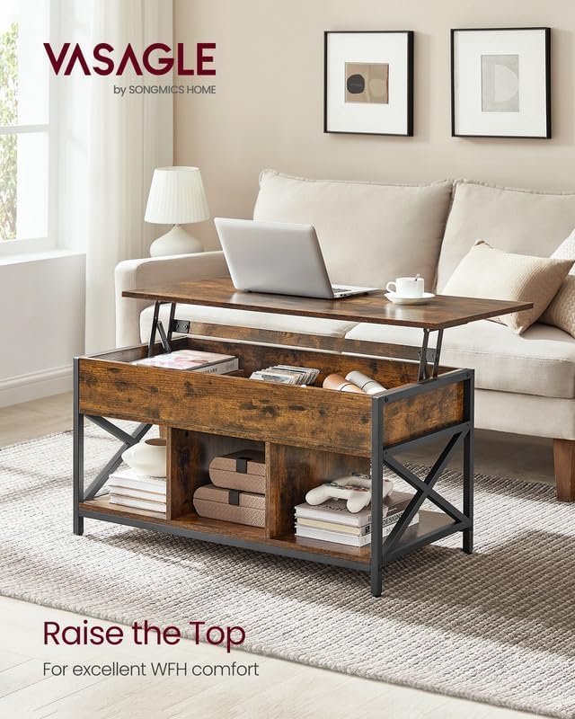 Lyftbart soffbord med förvaringshylla, dolda fack, rustikt brunt och svart