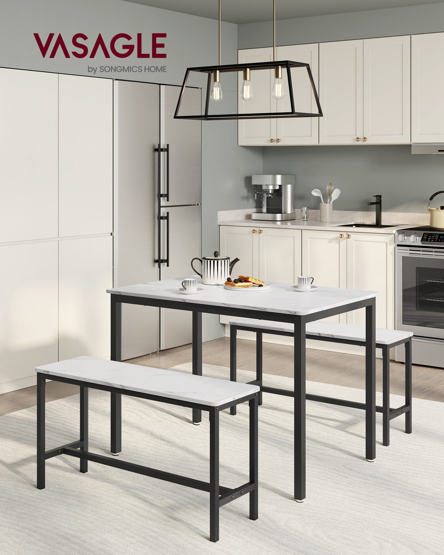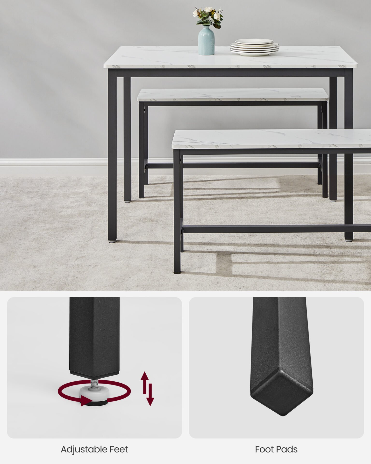 Matbordsgrupp för 4 personer, köksbord med 2 bänkar, marmorvit och bläcksvart