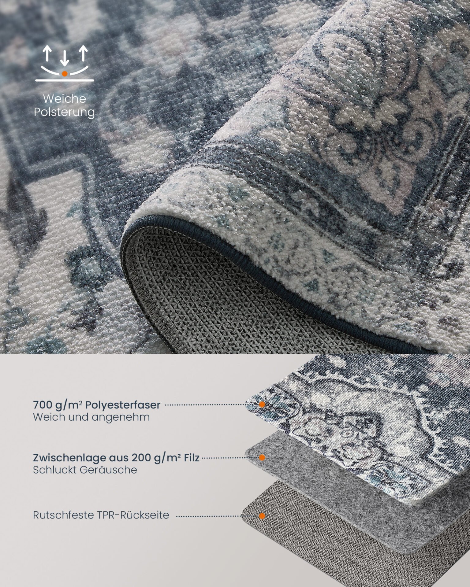 Halkfri och mångsidig: mattans baksida är tillverkad av TPR och är därför särskilt halkfri, vilket gör den perfekt för olika golvbeläggningar, t.ex. för trägolv, kakel med mera.