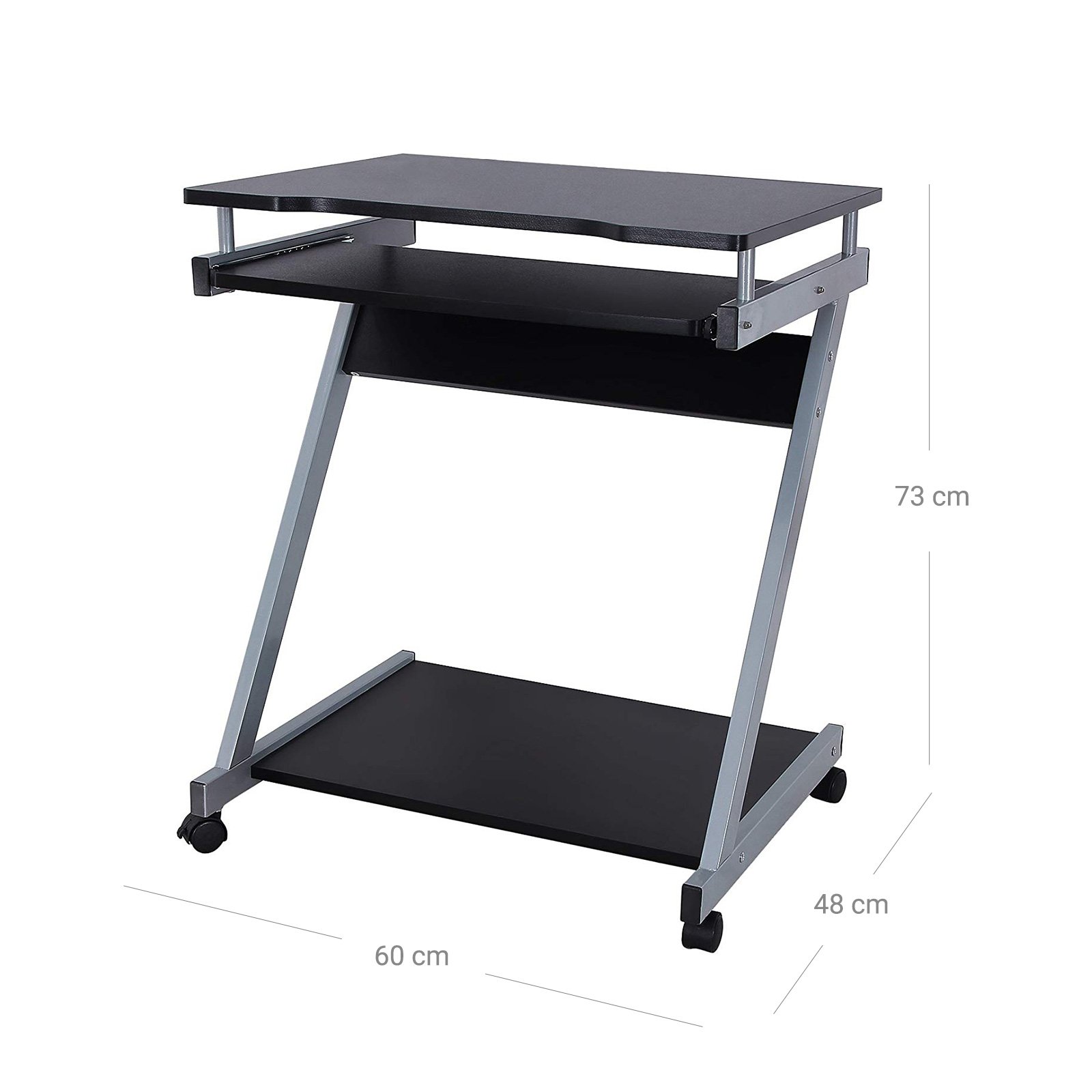 Specifikationer:- Färg: Svart- Material: Stålrör, spånskiva med melaminfaner- Produktstorlek: 60 x 48 x 73 cm (L x B x H)- Paneltjocklek: 15 mm- Produktvikt: 9,5 kg- Max. statisk lastkapacitet för bordsskiva: 30 kg- Max. statisk lastkapacitet för bottenhylla: 10 kg Förpackningens innehåll:- 1 x Mobilt datorbord- 1 x Tillbehörskit- 1 x Instruktioner (EN, DE, FR, ES, IT)