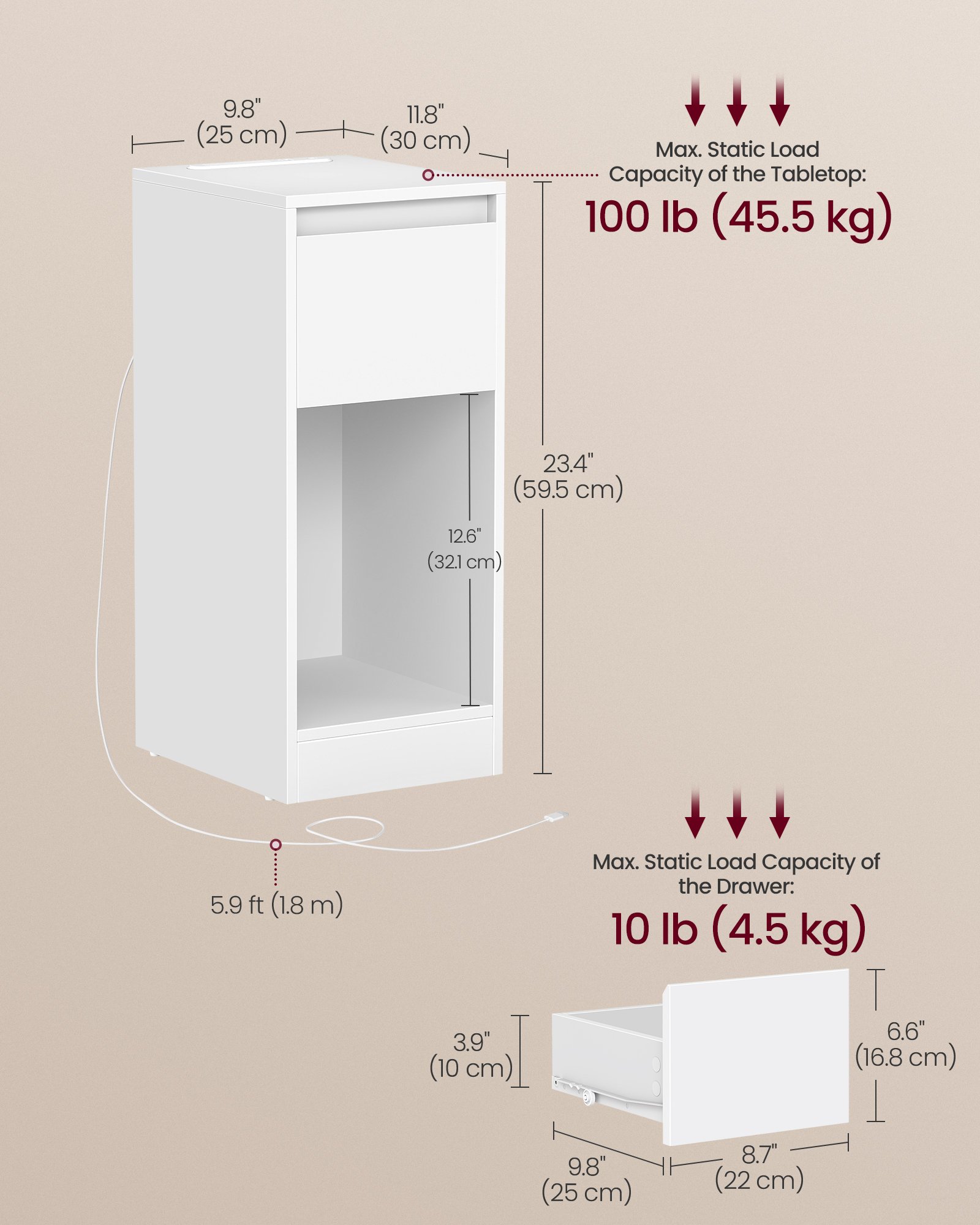– Max. statisk viktkapacitet för lådan: 10 lb (4,5 kg)