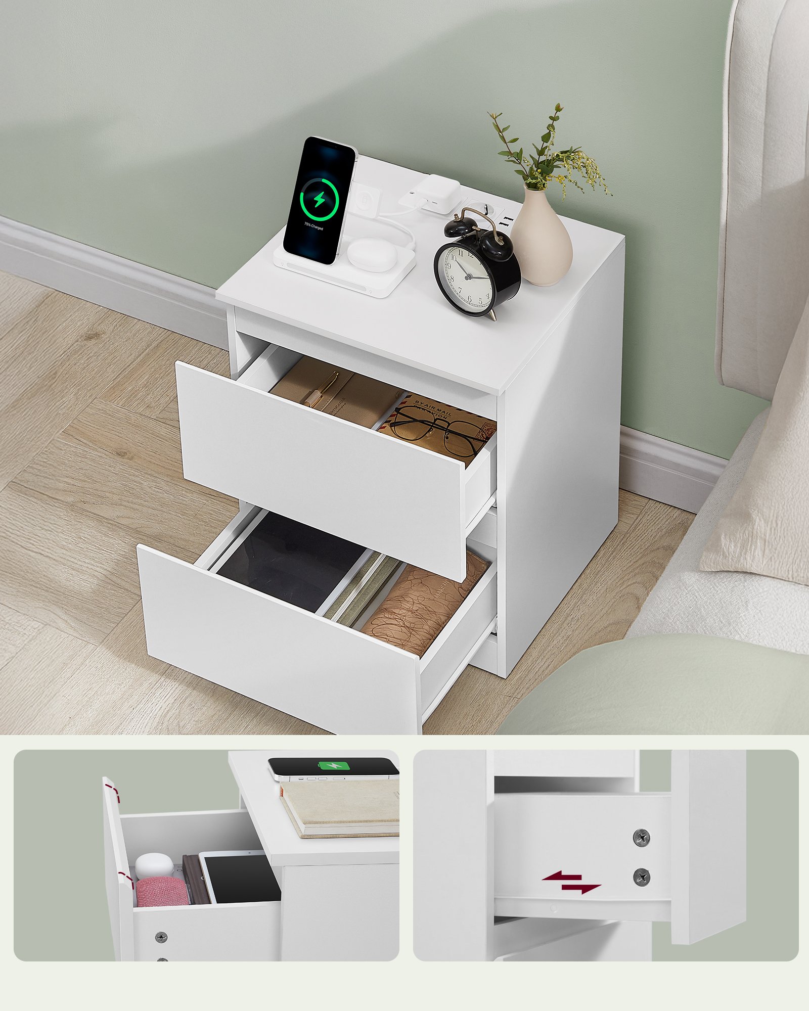 Enkel montering: Tack vare tydligt markerade delar och lättförståeliga instruktioner är det enkelt att montera detta nattduksbord med lådor.
