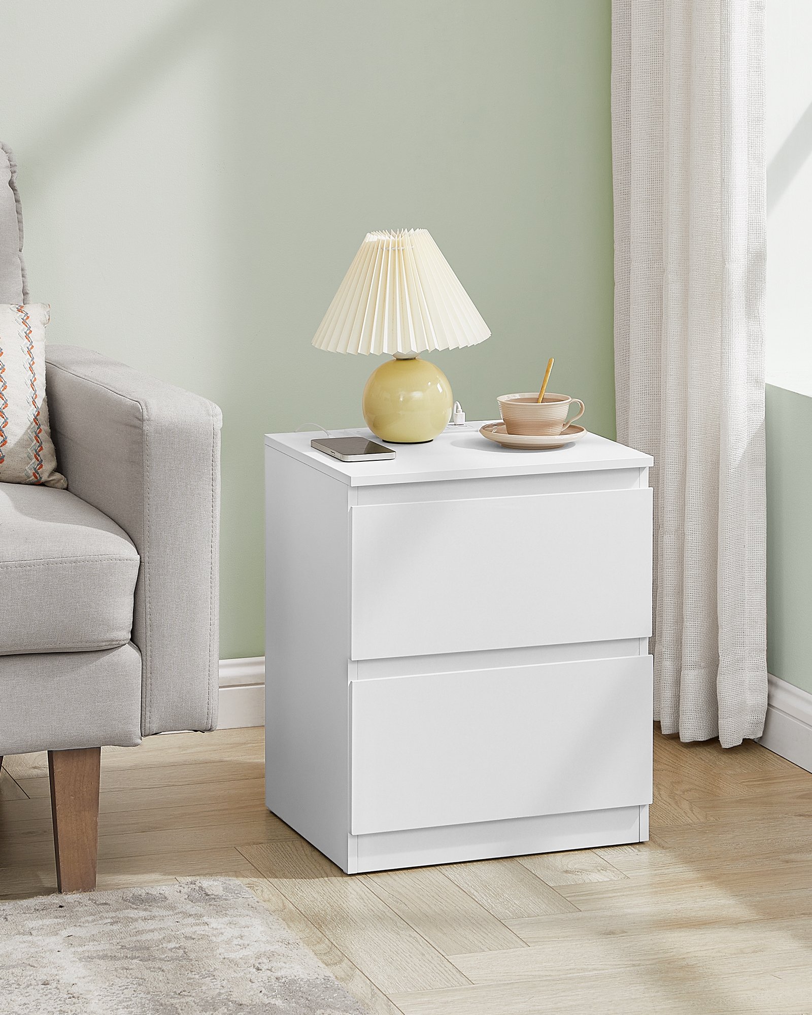 Nattduksbord med grenuttag, set med 2 sidobord, 2 AC-uttag, 2 USB-A-portar, vit