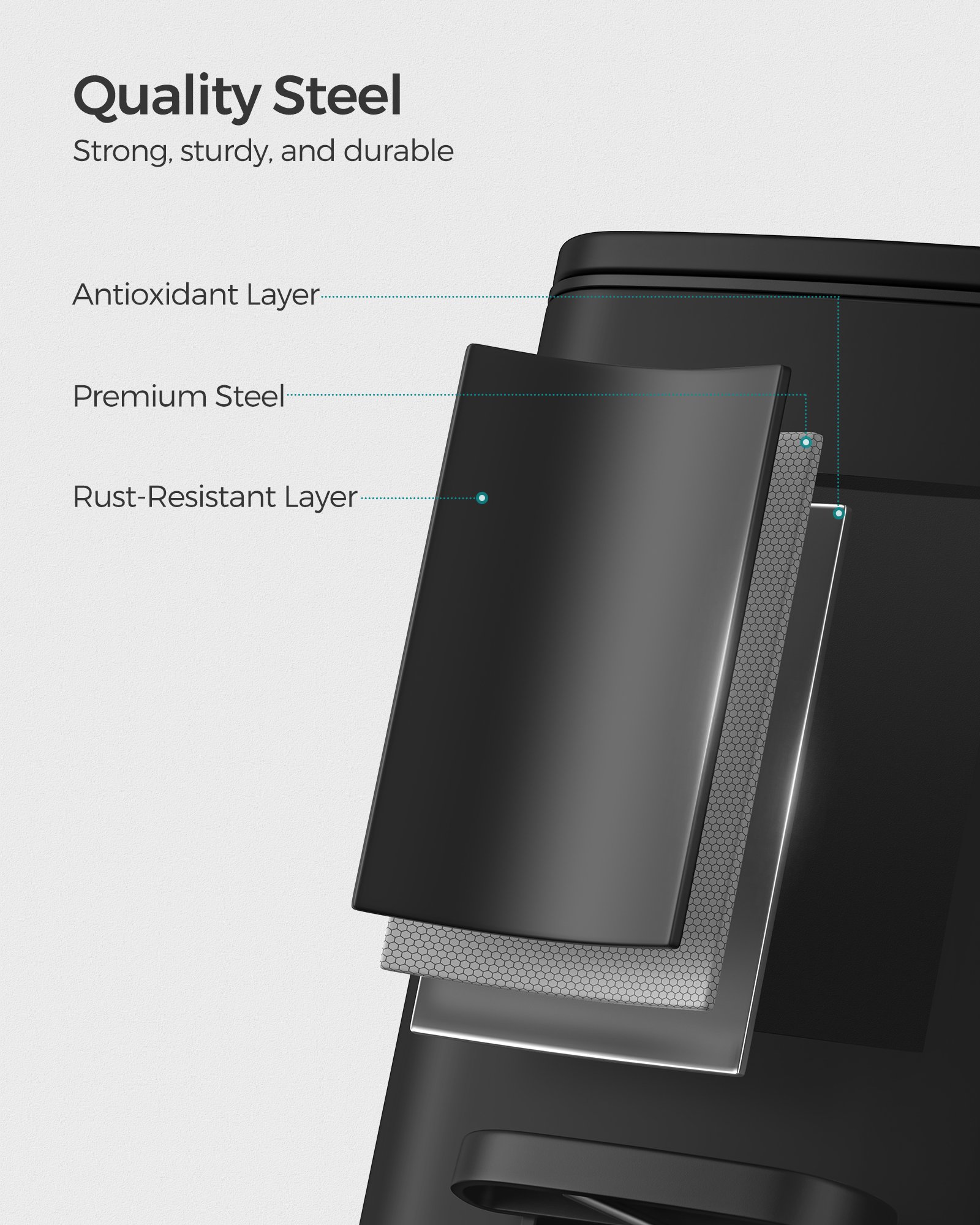 Förvandla din köksrutin med denna noggrant designade papperskorg. Dess platsbesparande form passar sömlöst in i alla hörn och maximerar ditt köks potential utan att offra kapaciteten. Den stabila, halkfria basen håller den stadigt på plats, avskräcker nyfikna husdjur samtidigt som den bibehåller en prydlig miljö. Med en modern stålfinish som motstår rost och torkar enkelt ren är den lika snygg som den är praktisk. Njut av det mjukstängande locket för lugn användning, och innerhinkens smarta design gör påsbyten snabba och prydliga.