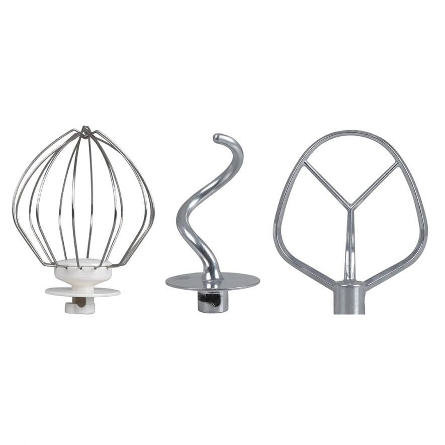 Satsen innehåller: tre tillbehör (för blandning, knådning och vispning), en spatel och ett transparent lock . Tillbehören kan tvättas i diskmaskinen .