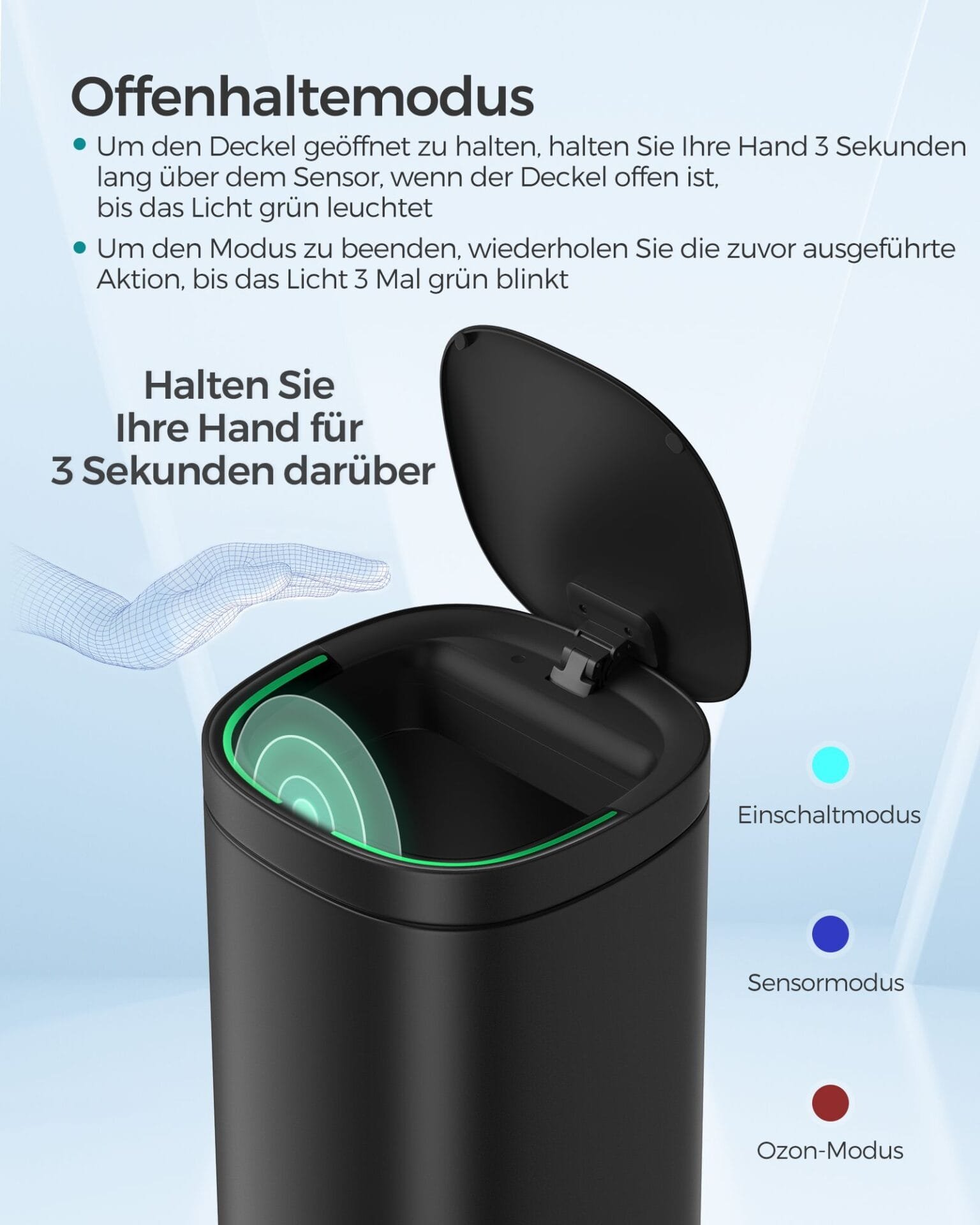 [4 arbetslägen] Flerfärgade indikatorlampor hjälper dig att använda soptunnan: vatten för start, blått för avkänningsläge, grönt för öppet läge (håll handen över sensorn i 3 sekunder medan den är öppen) och röd för ozonläge