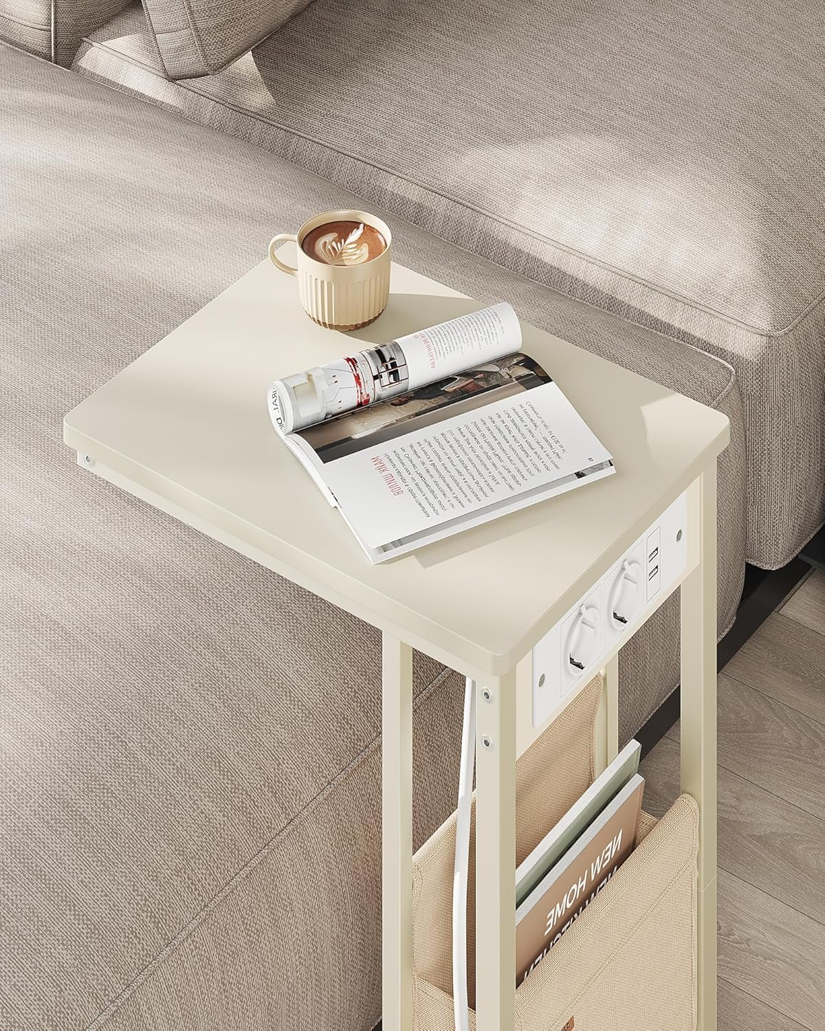 Sidobord, Nattduksbord med Uttag, C-formad, Soffbord, Krämvit
