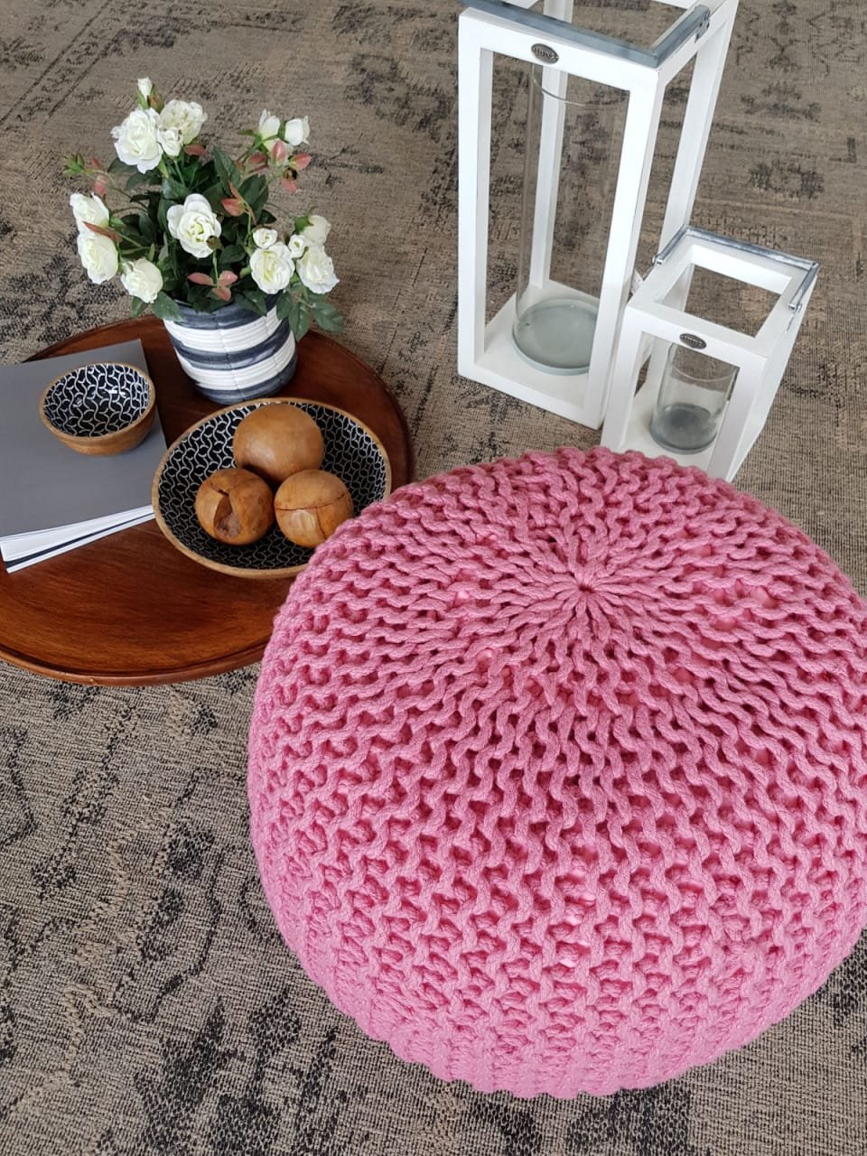 stickad puff rosaSittpuff Stickpall Ø 55 cm Terrass Pool Trädgård Hållbar – rosa