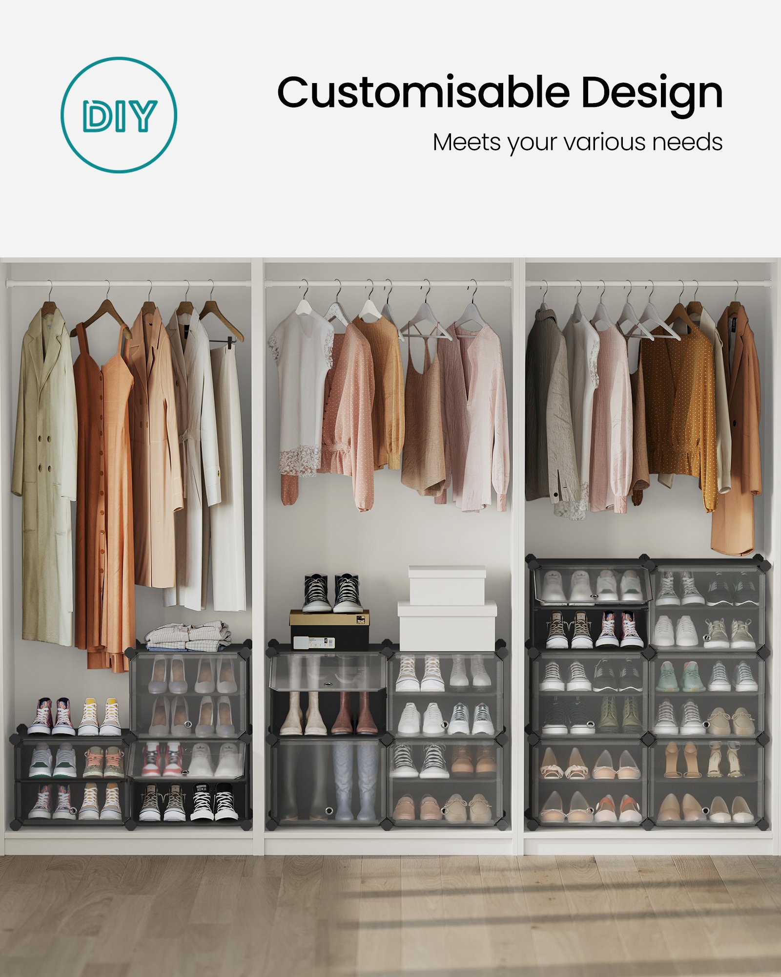 Gör-det-själv och mångsidigt: Arrangera denna förvaringsenhet som en enda hög hylla, 2 eller 3 separata rader, eller till och med dela upp i 2 mindre enheter för att organisera skor, väskor eller toalettartiklar i din hall, badrum eller andra utrymmen