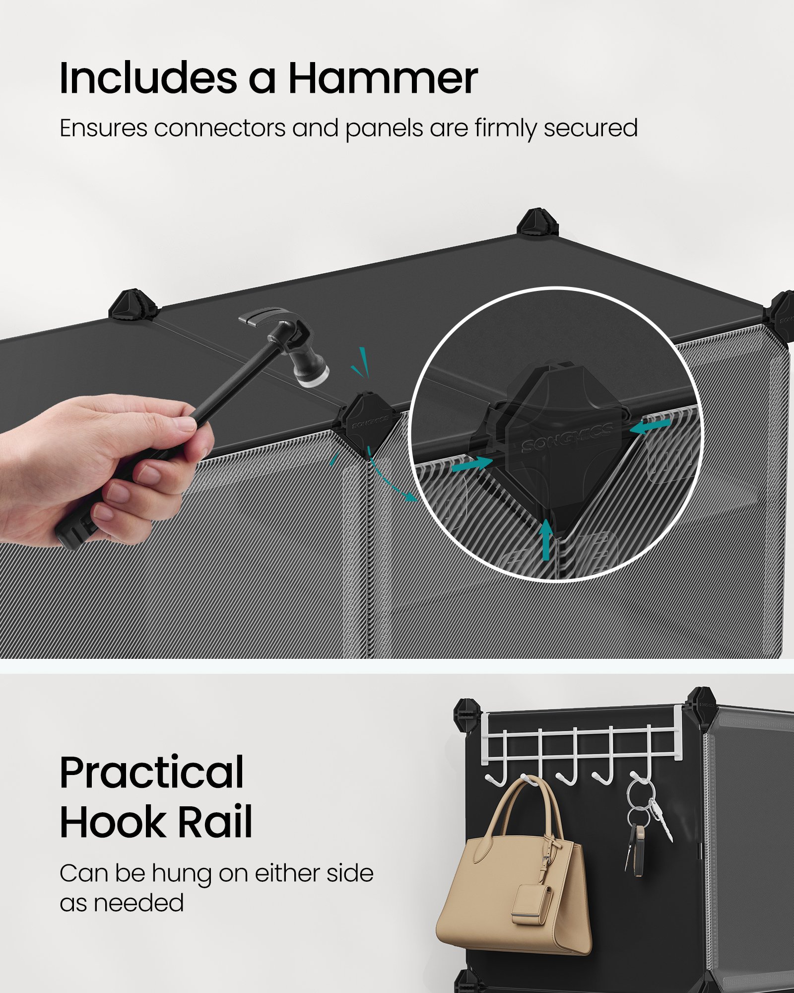 Enkel montering och säker anslutning: Med den medföljande klubban kan du snabbt montera din skohylla, vilket säkerställer att varje kontakt och panel sitter tätt för en säker och vibbfri förvaringslösning