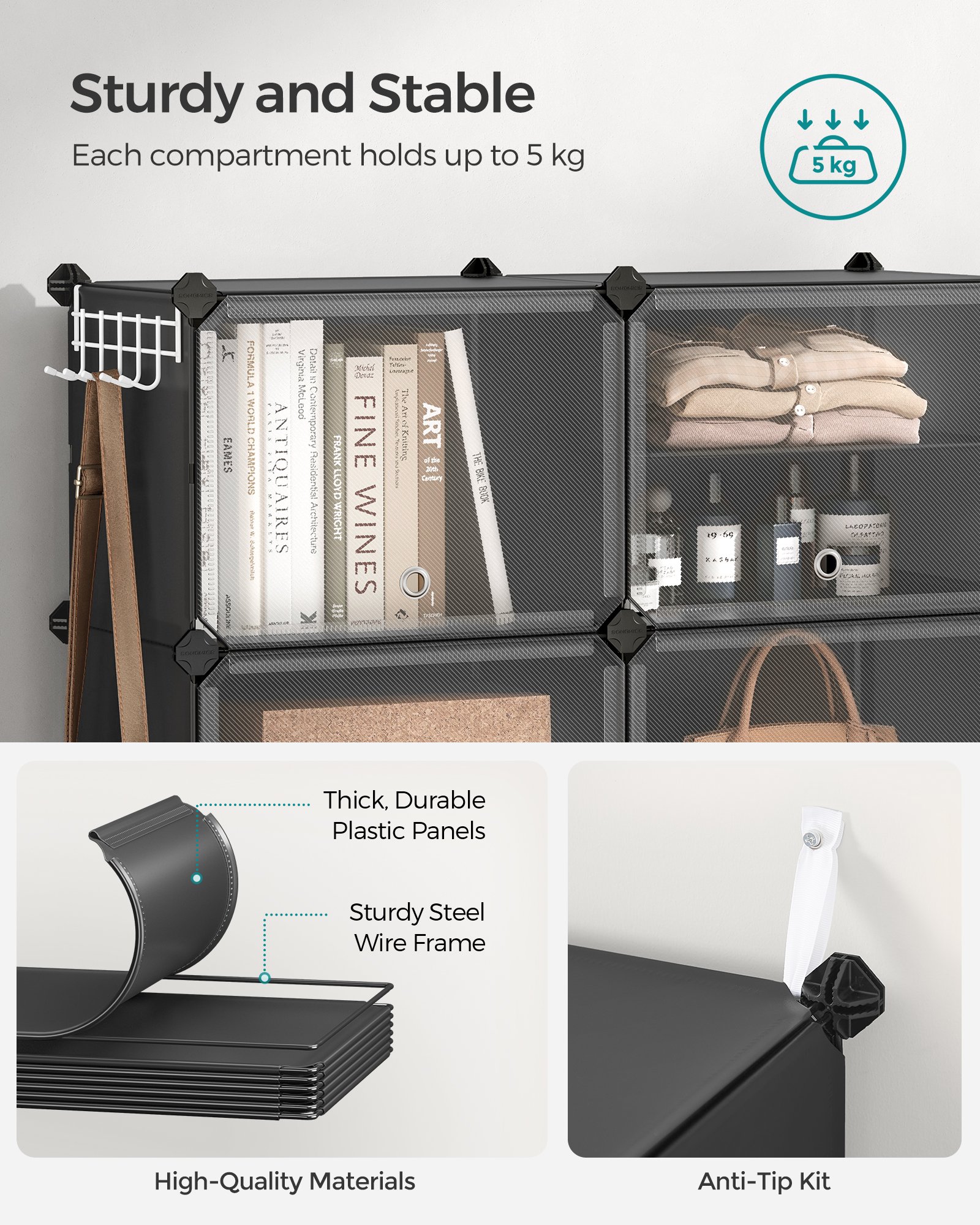 Robust och säkert: Premiumkontakter och robust ståltråd kombineras med slitstarka plastpaneler, så varje fack rymmer upp till 5 kg, och tippskyddskitet hjälper till att hålla din skohylla säker i ditt vardagsrum eller sovrum