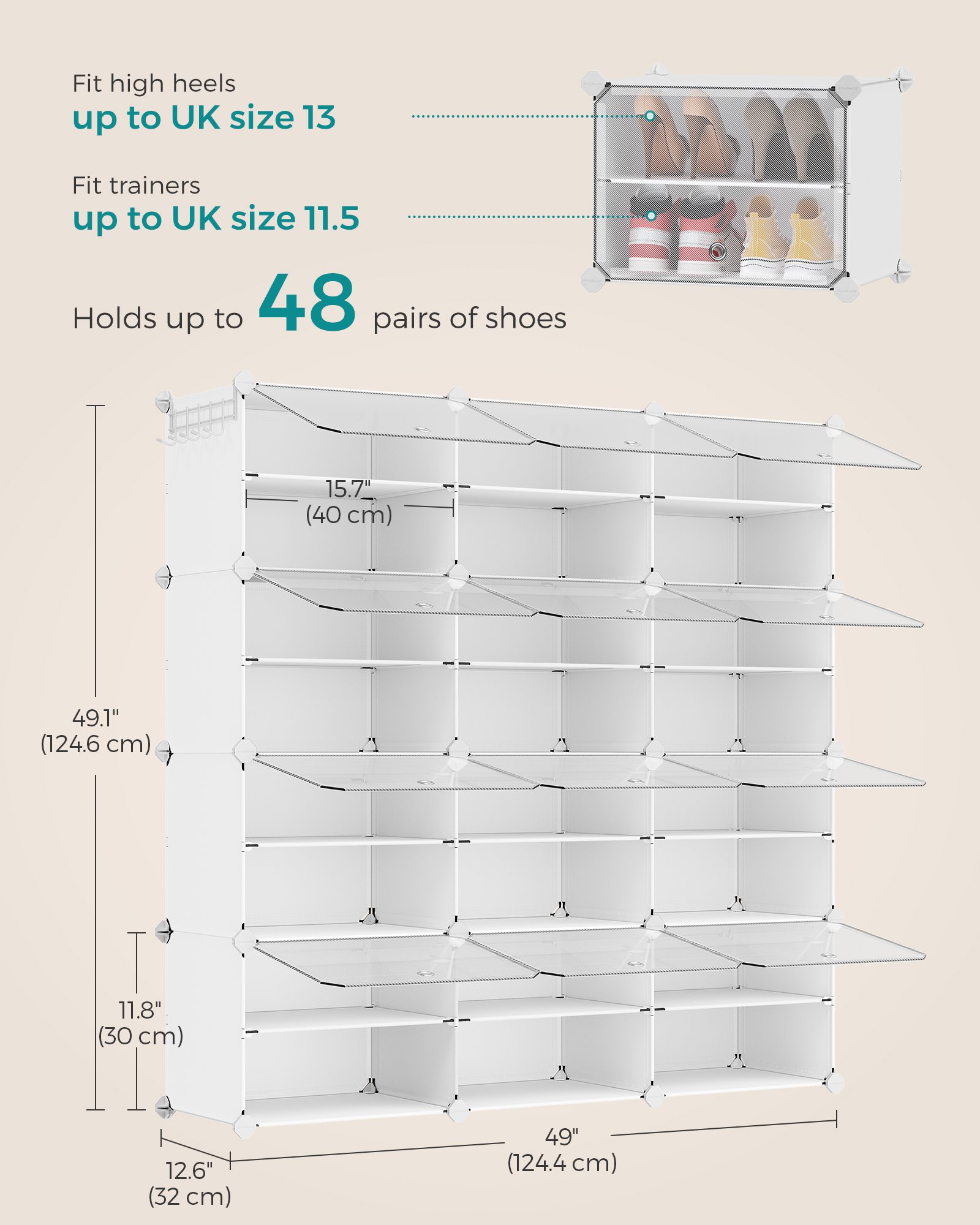 12-våningars stor kapacitet: Förvara upp till 48 par skor, från höga klackar och stövlar till träningsskor och tofflor, med praktiska sidokrokar för att hänga hattar eller koppel.