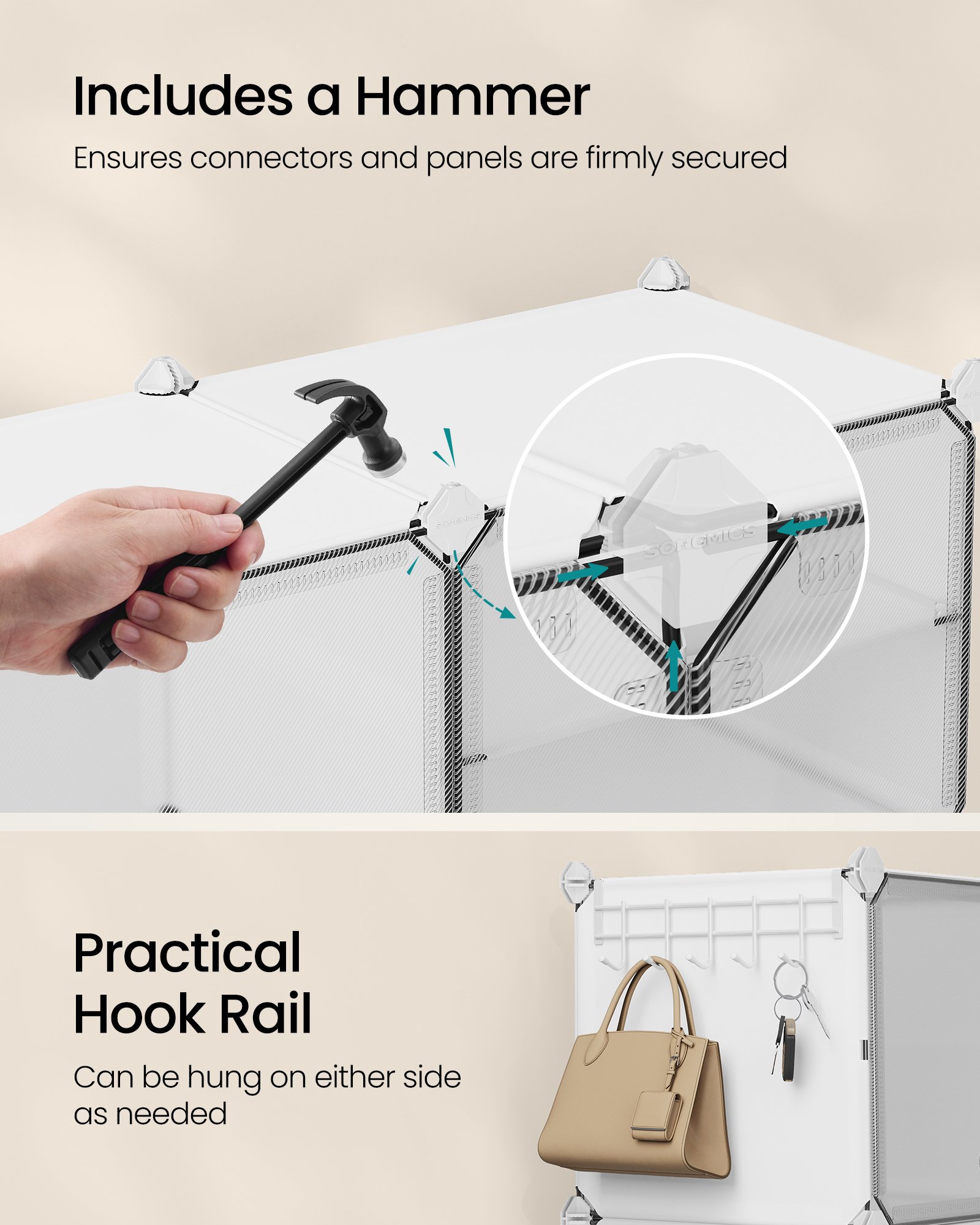 Enkel montering och säker anslutning: Med den medföljande klubban kan du snabbt montera din skohylla, vilket säkerställer att varje kontakt och panel sitter tätt för en säker och vibbfri förvaringslösning.