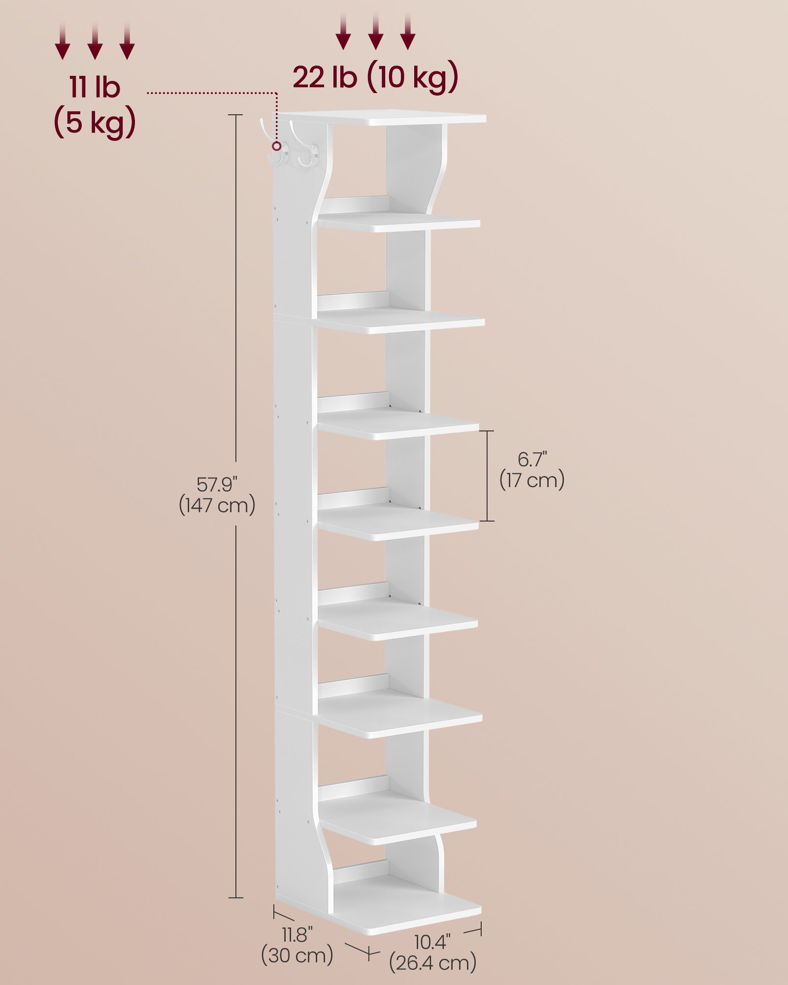 [Vad du får] En smal skohylla med 9 våningar med bakre brädor för att öka stabiliteten och skydda din vägg från repor, plus ett tippskydd som hjälper dig att fästa skostället på väggen för säkerhet