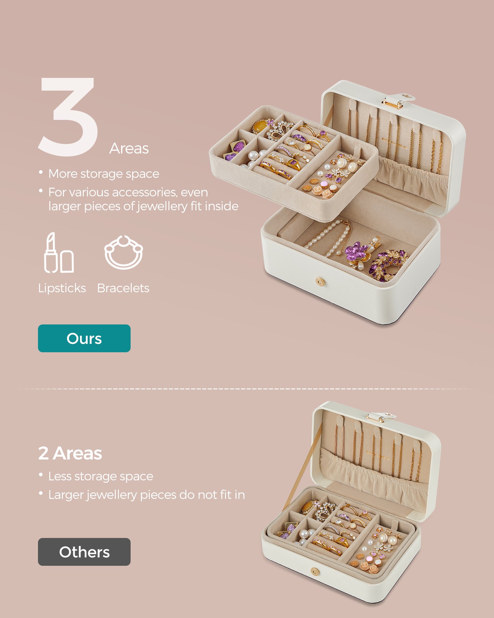 – Gott om förvaring i 2 lager: Detta smyckeskrin har gott om plats för att förvara dina ringar, örhängen, halsband, armband och mer.