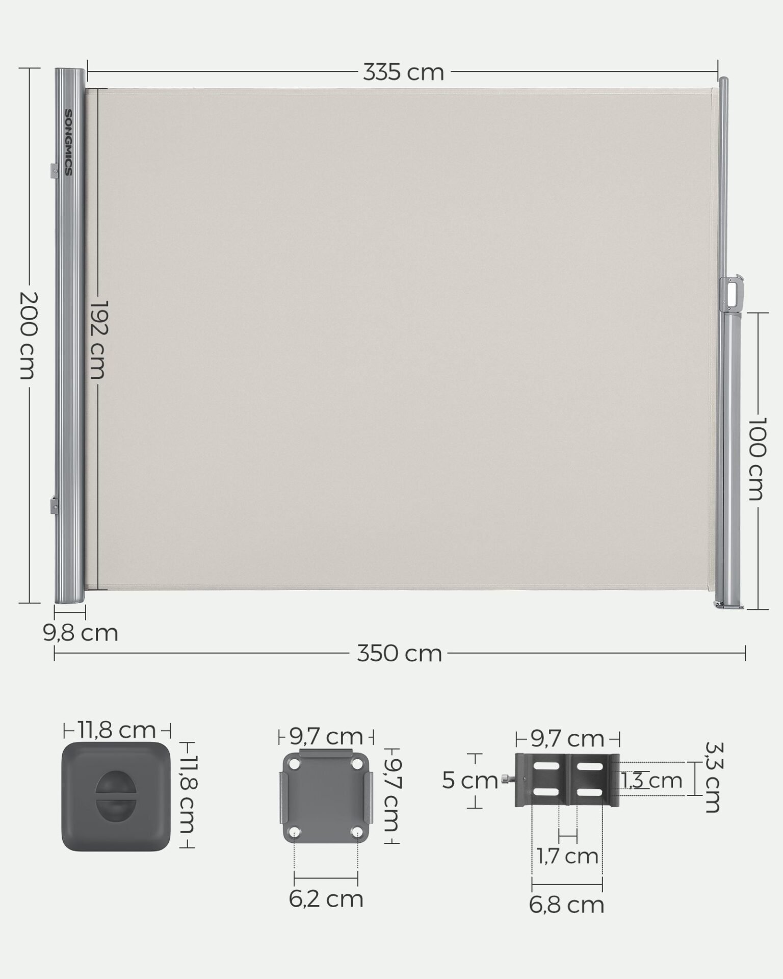 Specifications:- Colour: Beige- Material: Aluminium Alloy, 280 g/m² Polyester, PU Coating- Product Size: 2 x 3.5 m (H x L)- Product Weight: 10 kg Package Contents:- 1 x Side Awning- 1 x Accessory Kit- 1 x Instructions (EN, FR, IT, DE, ES)