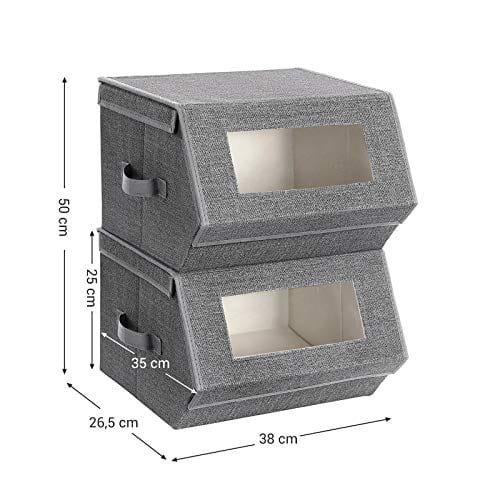 Specifikationer:- Färg: Grå, beige-Material: Fibertyg med linnestruktur, järnram, kartong- Produktstorlek: 38 x 35 x 25 cm (LXBXH)- Produktvikt pr. Box: 2 kg-max. . Statisk lastkapacitet per Kartong: 10 kg Förpackningsinnehåll: – 2 x Förvaringslåda – 1 x Instruktioner (EN, DE, FR, ES, IT)